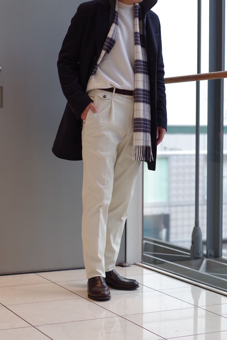 SANOとは対照的にホワイトのトーンで合わせた柔らかいOFFのコーディネート。