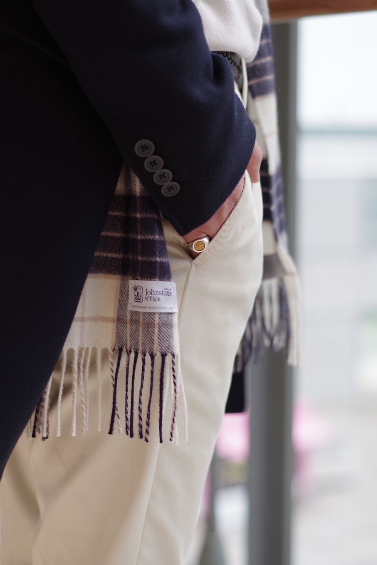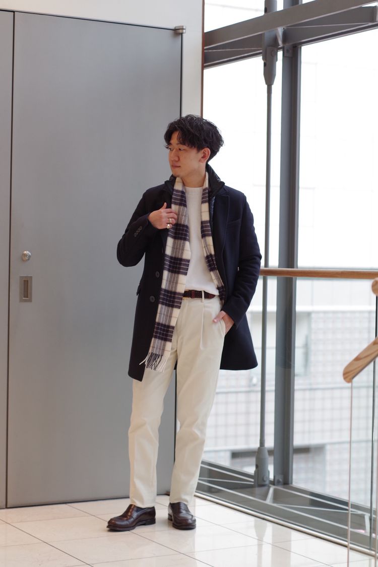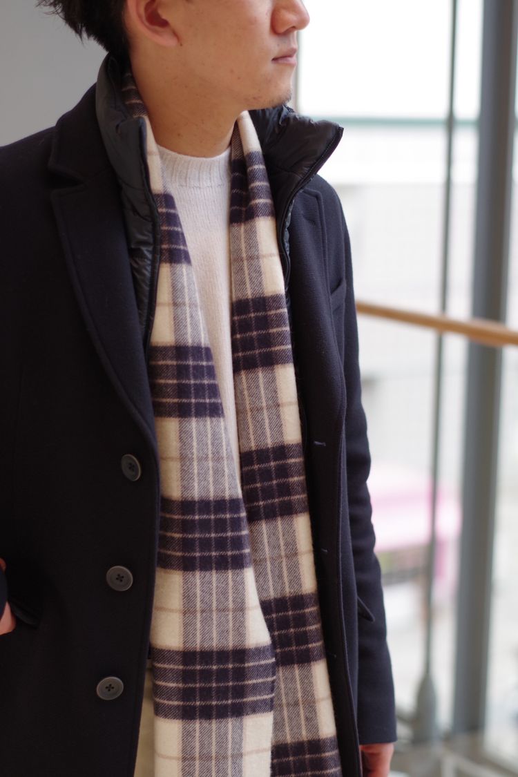首に沿わせたチェックのカシミヤマフラーがポイントになり、