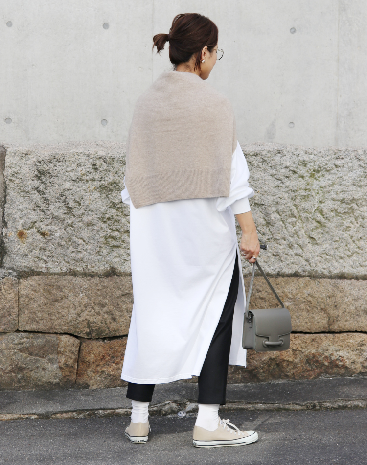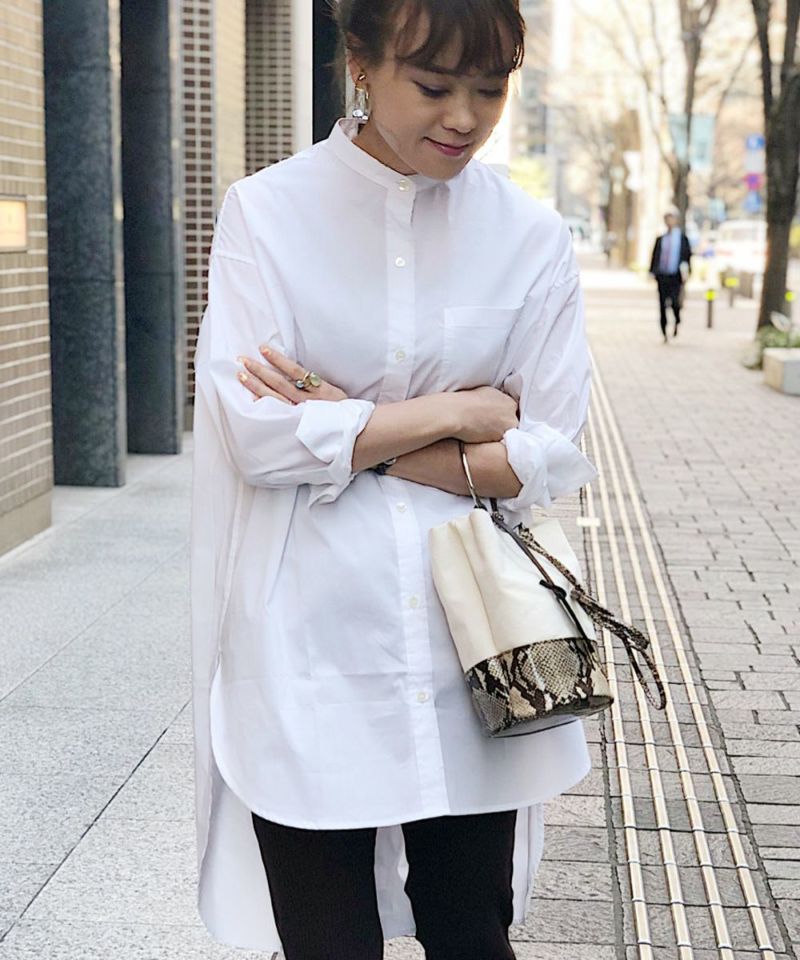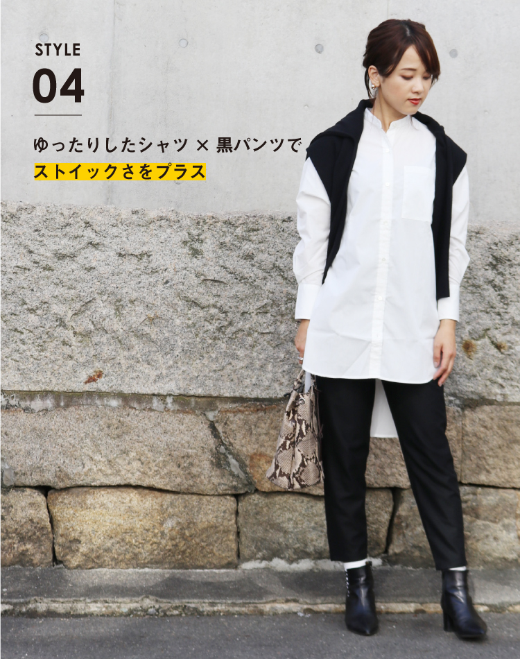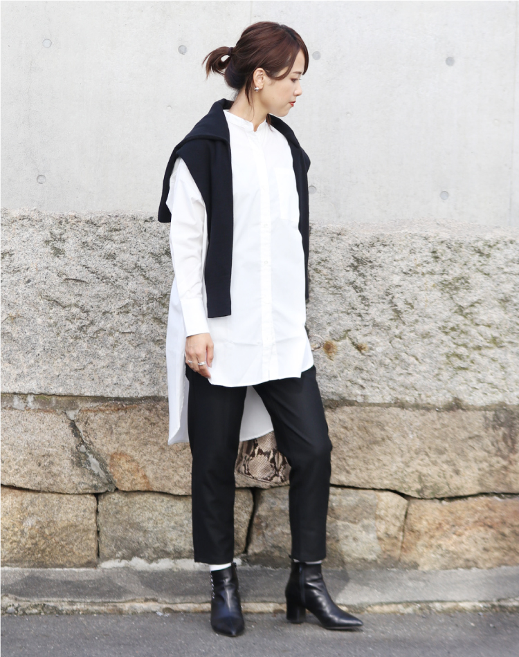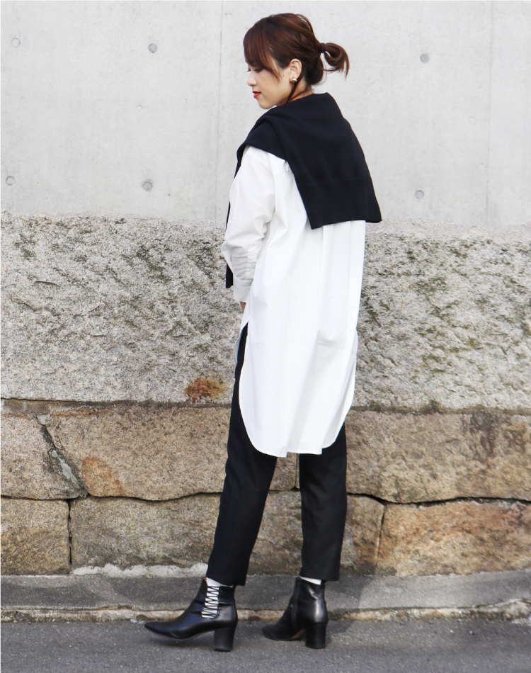 前後差のある大きめホワイトシャツは、ボトムスで引き締めるのが正解。