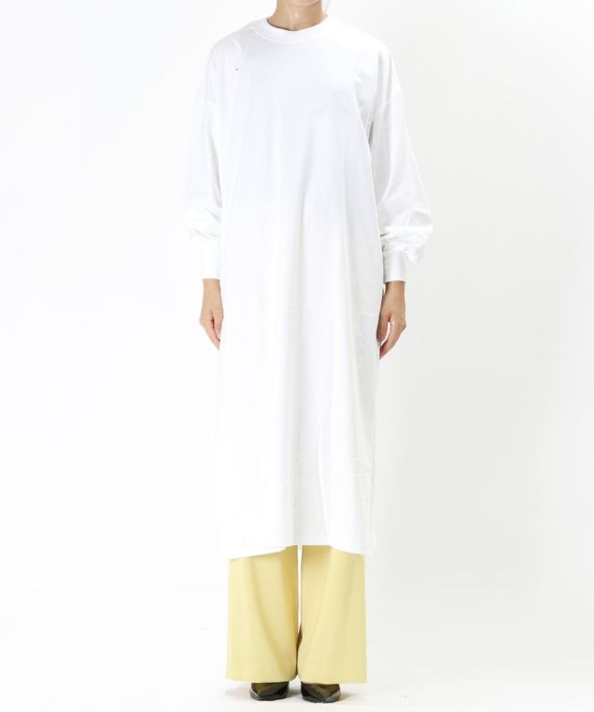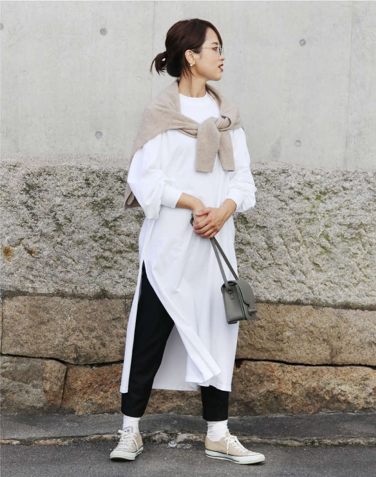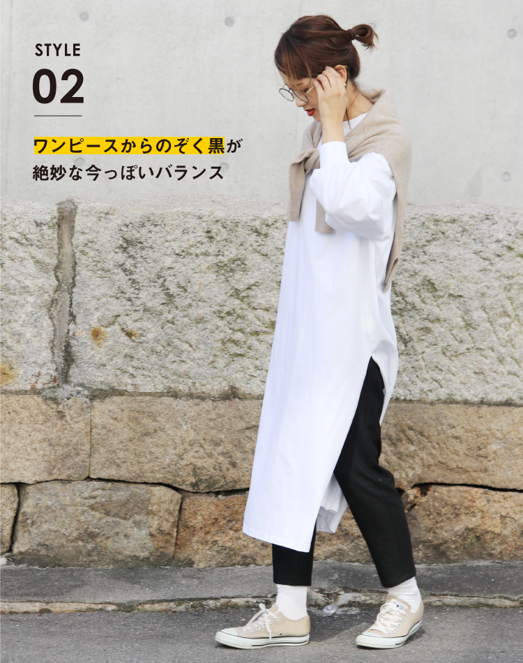 カジュアルになりがちなカットソーワンピを、黒パンツが上品に仕上げてくれます。