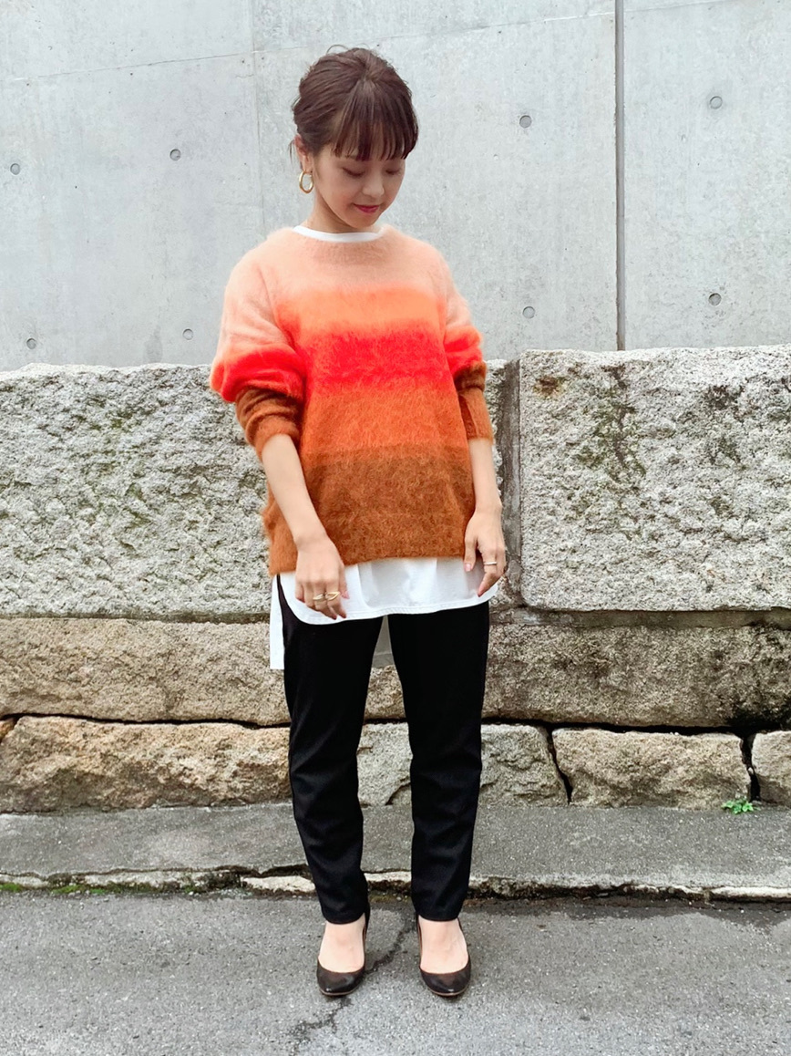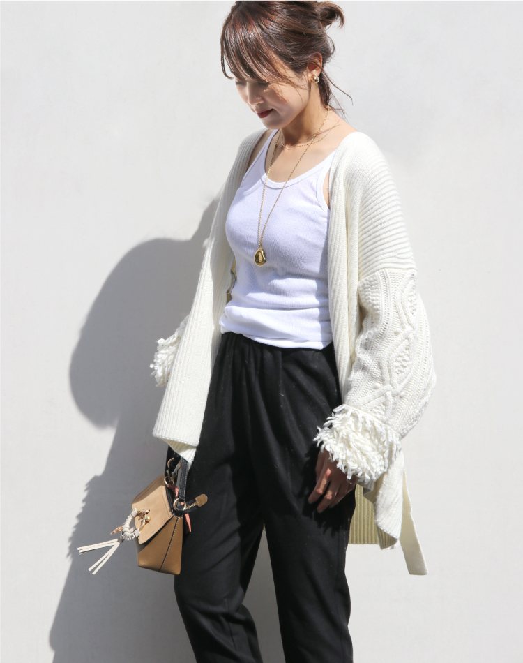 黒パンツを合わせれば、甘い雰囲気をほどよくキリッと引き締めてくれます。