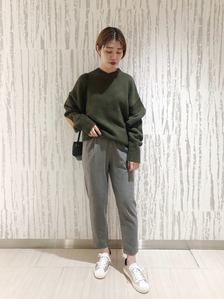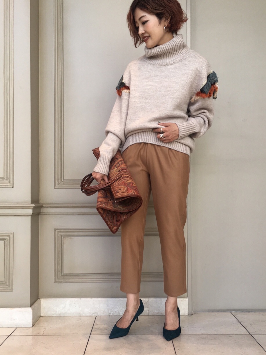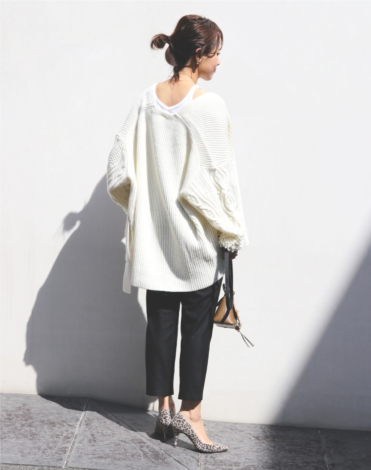 MARCO MASIのレオパード柄バッグ&ニットの肩掛けでメリハリのあるスタイリングが完成。