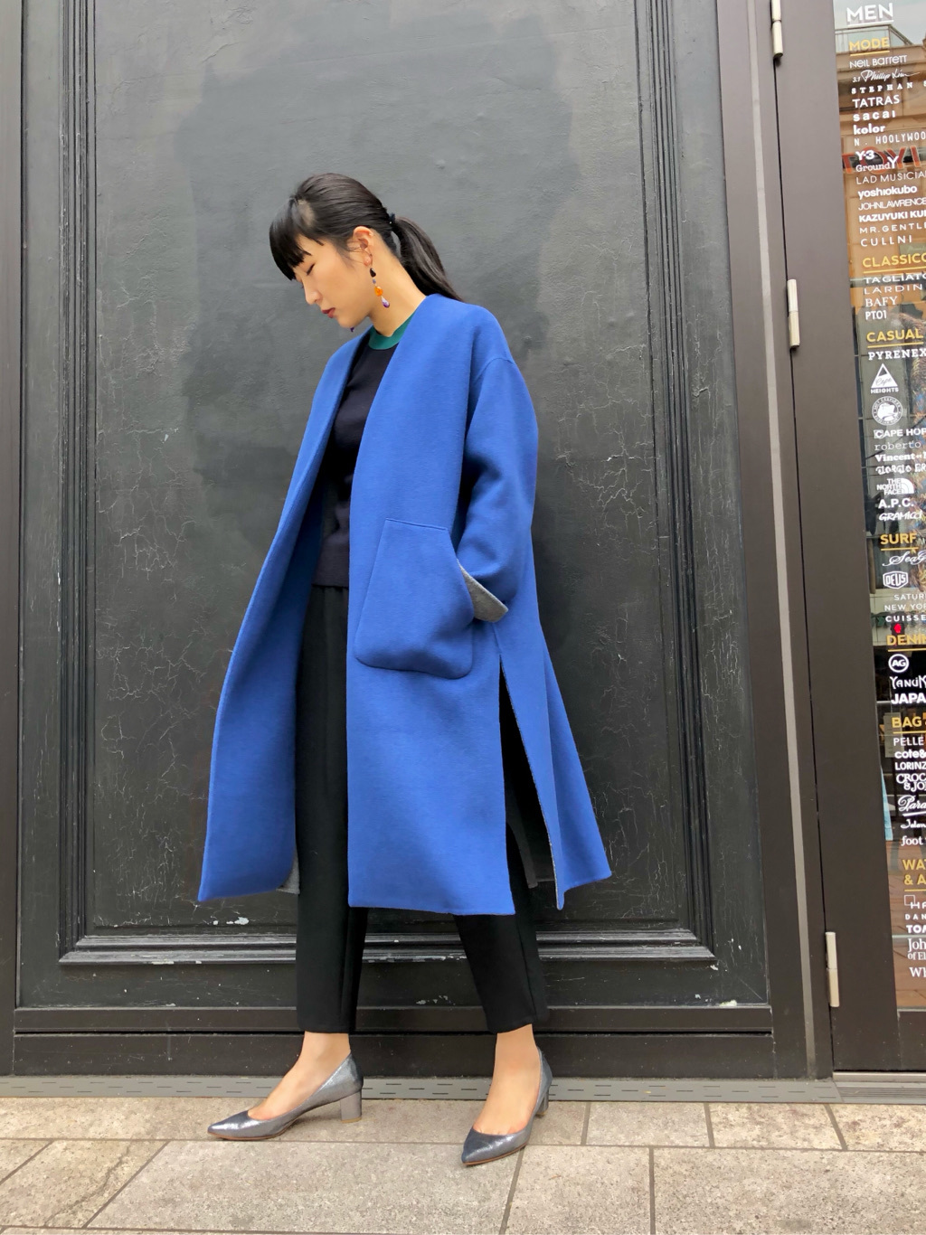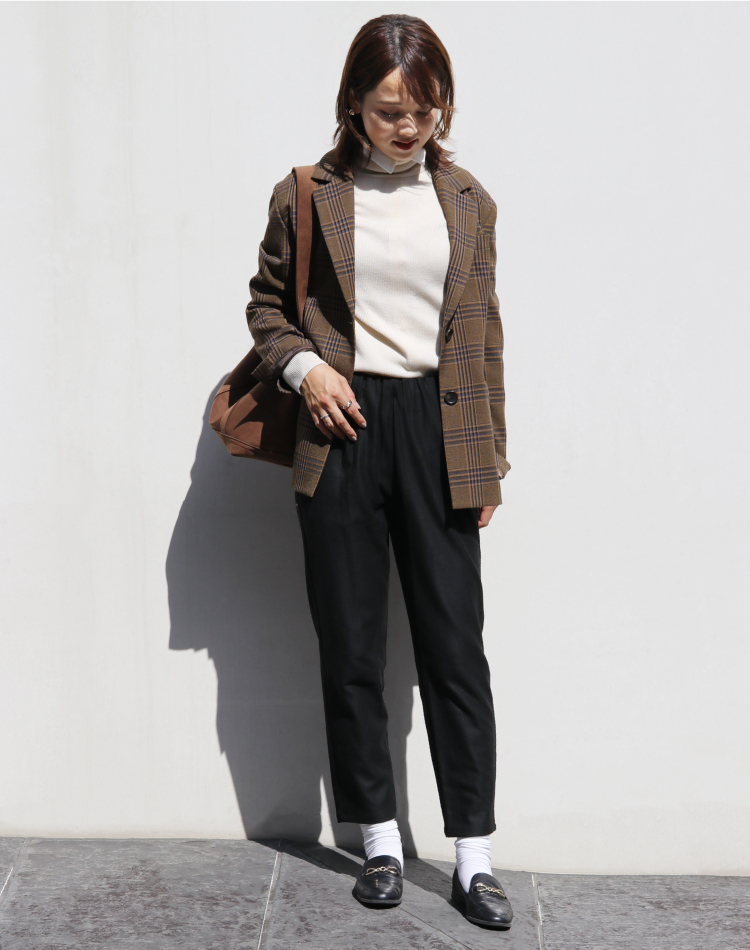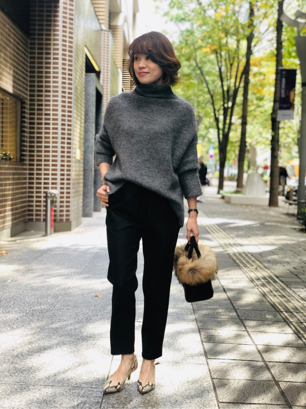 たくさん着込んでも、ボトムスを黒パンツで引き締めればスッキリとした印象に。