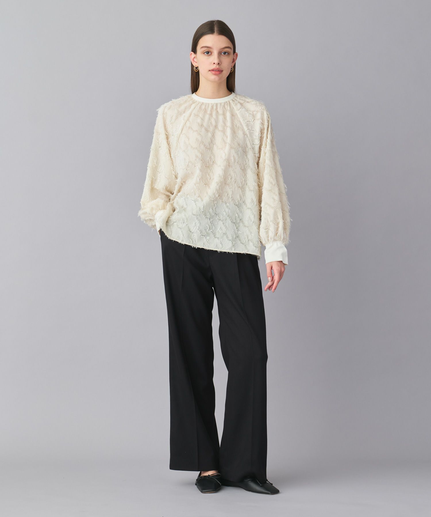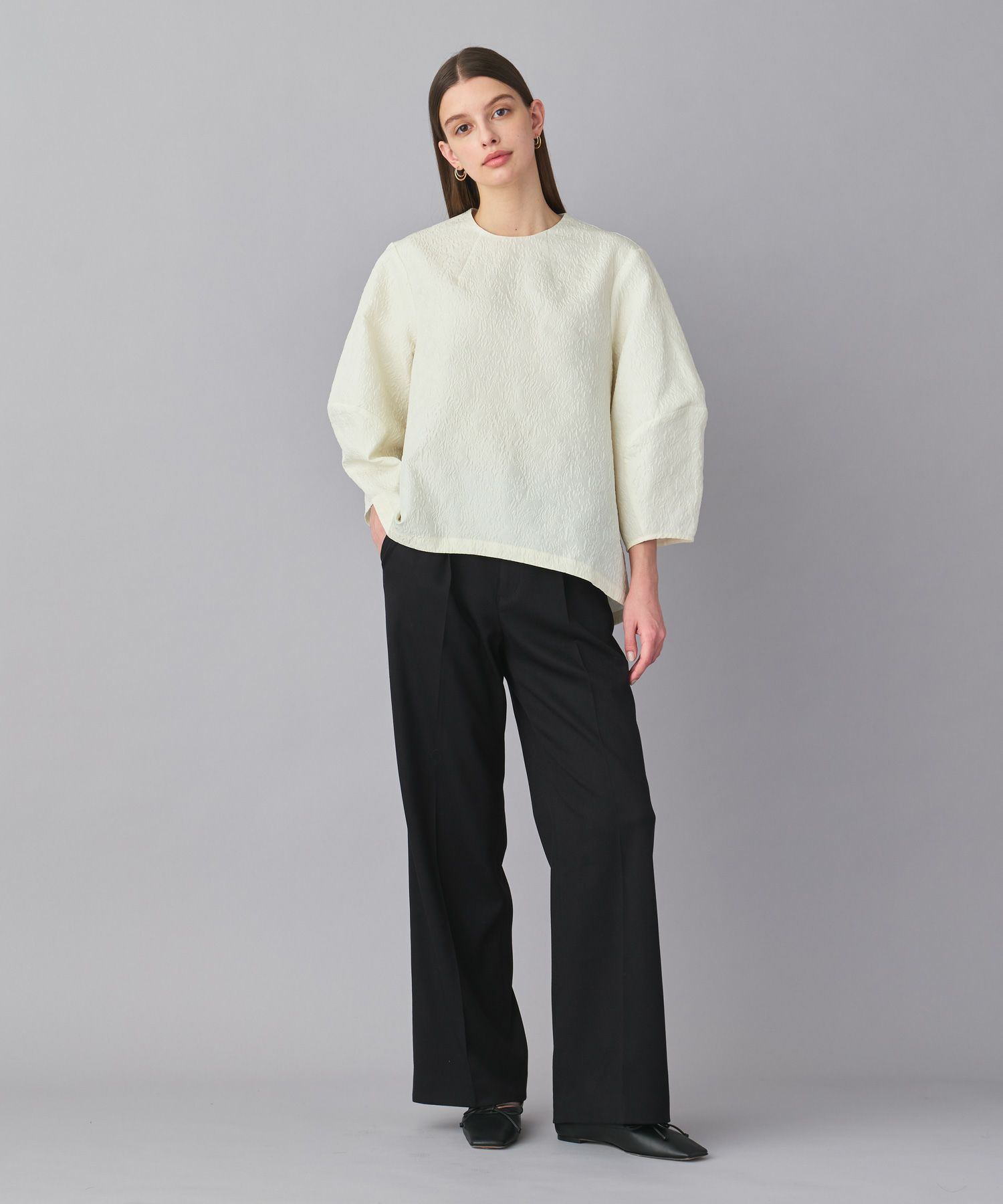 シンプルながらも品のあるセレモニースタイル。表情豊かなジャカード素材のアイボリーブラウスが、程よい華やかさを演出します。すっきりとしたシルエットのブラックパンツを合わせることで、洗練されたモノトーンコーデに。足元はブラックのシューズで統一し、フォーマルなシーンにも対応できる上品な装いに仕上げています。