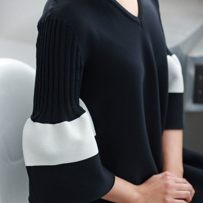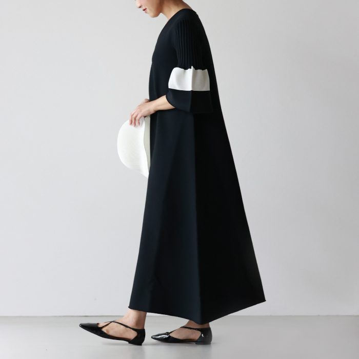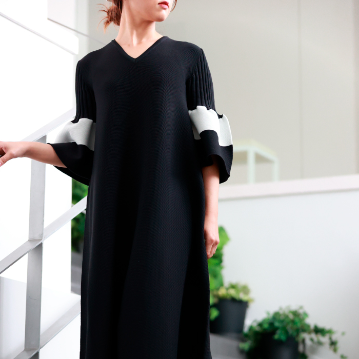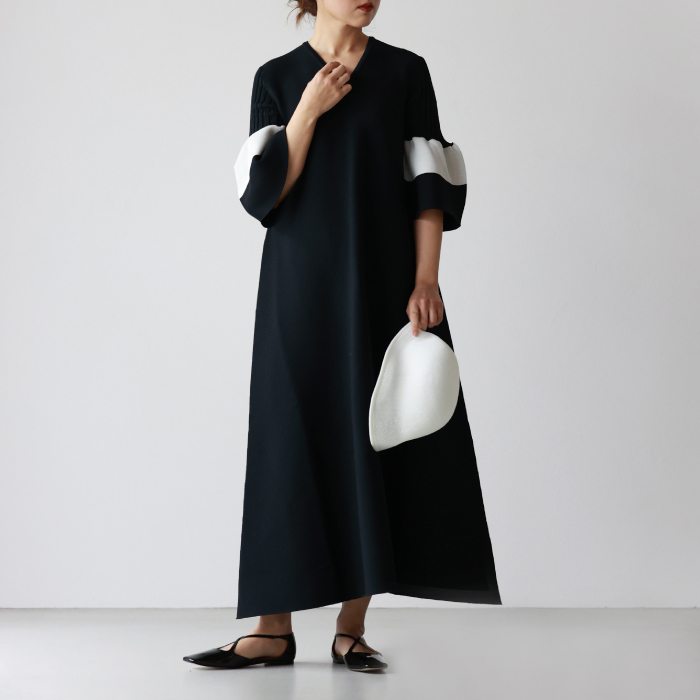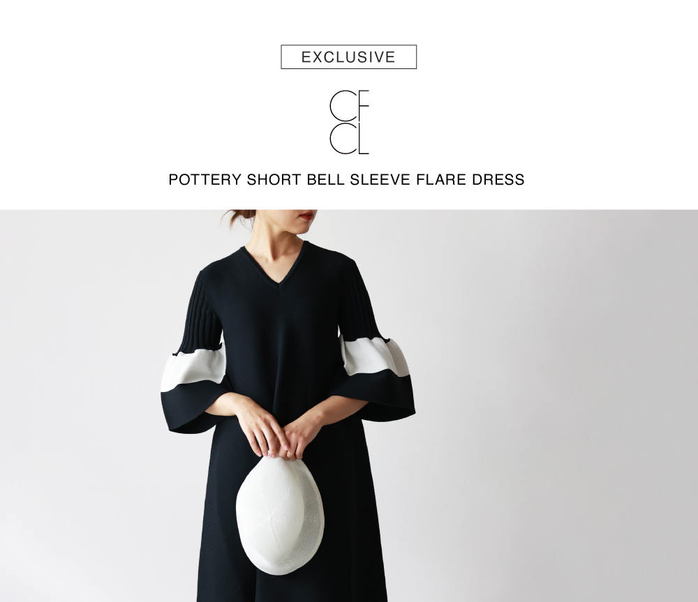 CFCLを象徴するPOTTERYシリーズのベルスリーブフレアドレス。株式会社アクセ100周年に合わせたオリジナルカラーにて展開。コンピュータープログラミングによって作られた、立体感のあるベルスリーブや洗練された印象のVネックは、あらゆるオケージョンに対応できるデザインです。ボディラインを拾わないフレアのシルエットで、縫代がないため、快適な着心地です。