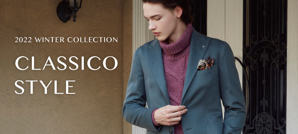 ピークドラペルのエレガントな仕立てはクラシックなムードを一層引き立たせる。