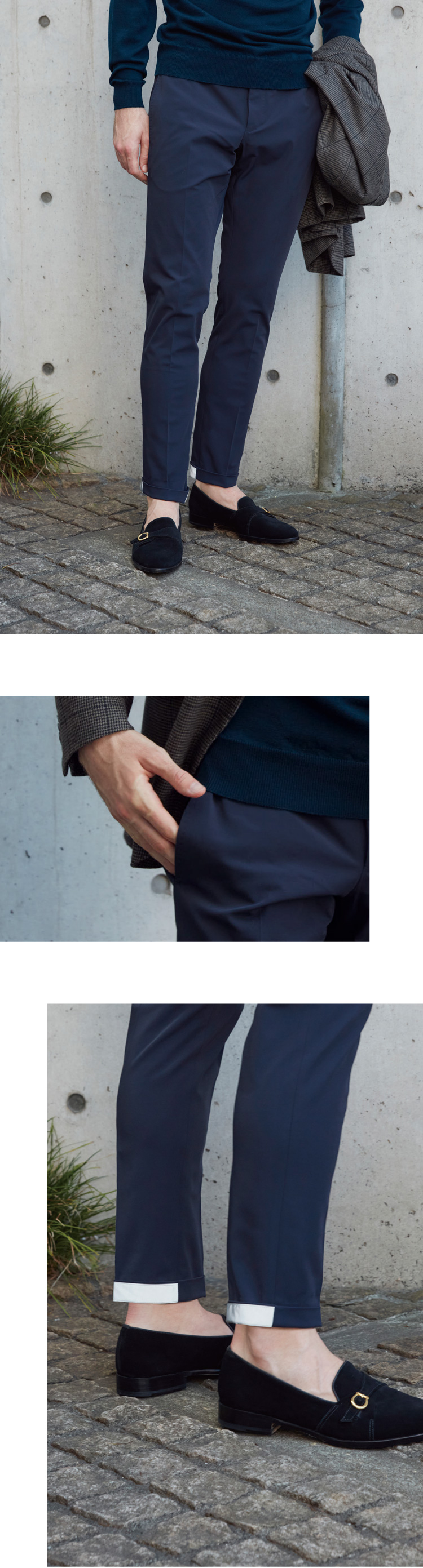 360°ストレッチ、形状回復、UVカット、速乾、吸湿といった様々な機能性を持ちながら、ウォッシャブルで利点だらけのナイロンスラックス。