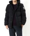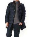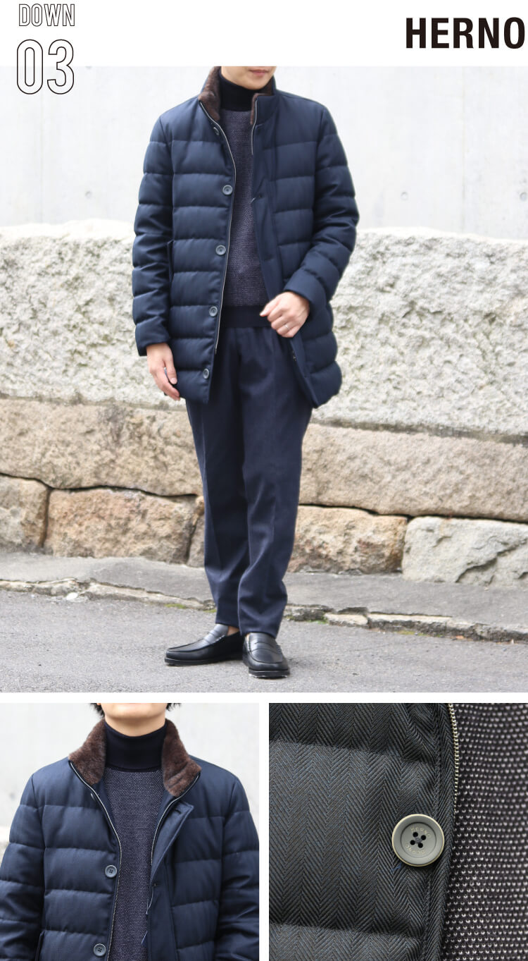 ヘリンボーン柄が特徴のダウンジャケット。ヘリンボーン特有の高級感ある綾織りの表面に合成樹脂ラミネート加工が施され、防寒性、耐水性など、より強度な1着です。ボタンにもブランドロゴが光ります。