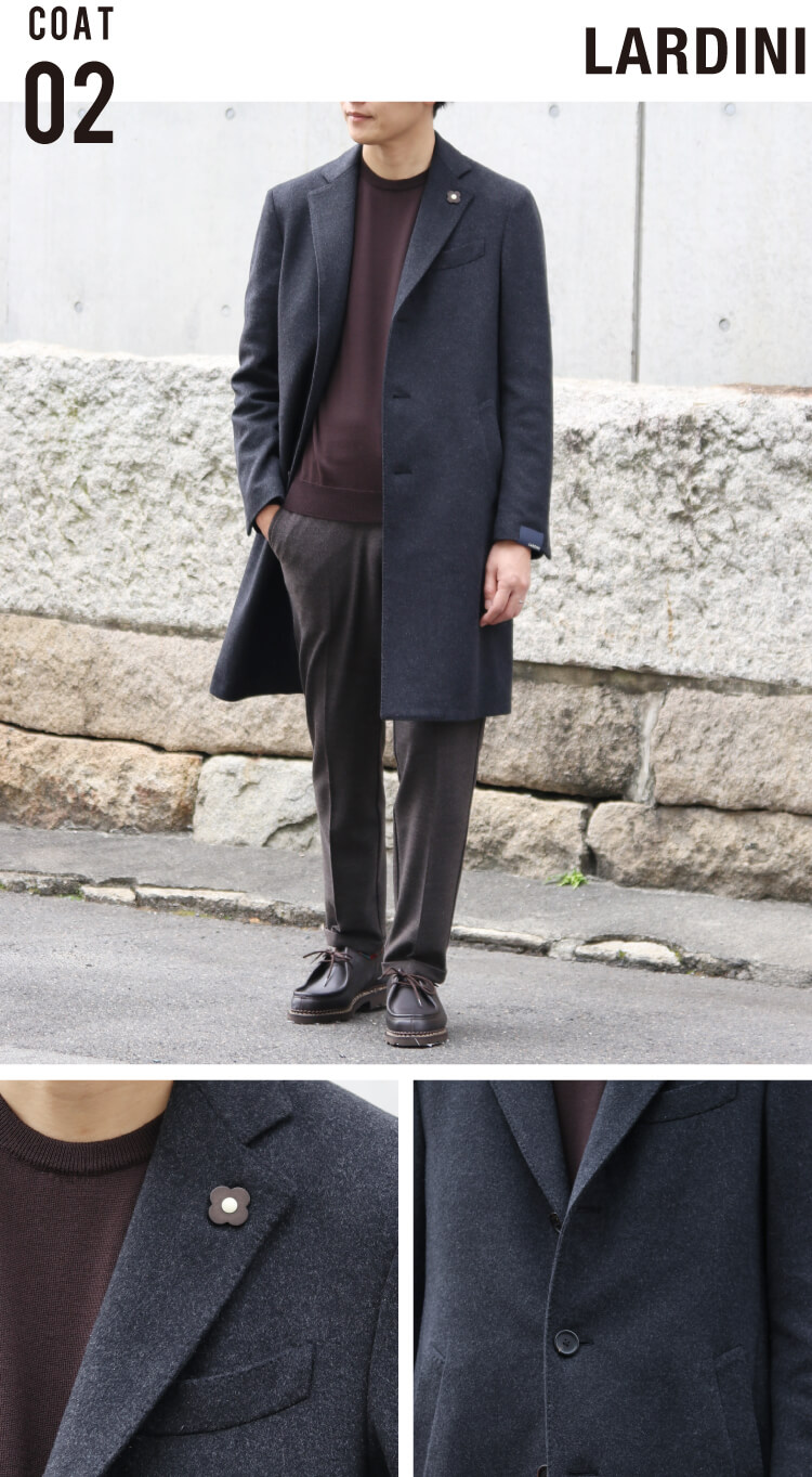 スタンダードなシルエットのラルディーニ定番のチェスターコート。エレガントかつシンプルな佇まいにブートニエールが光る仕上がりで、ビジネスシーンはもちろんカジュアルシーンにも活躍する一着に仕上がっています。