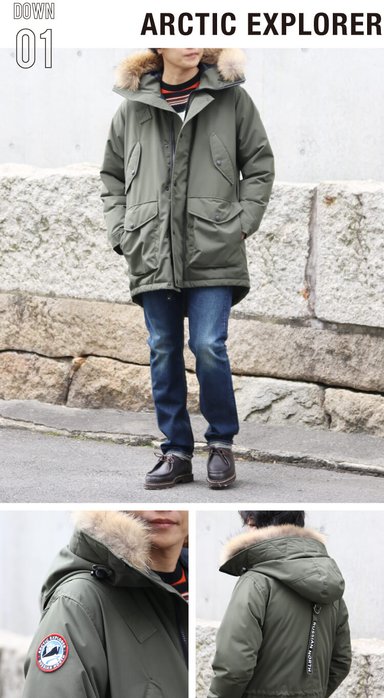 1950年代頃のM-65をベースに作られたデザインが魅力のモデル「BELUGA(ベルーガ)」。-30℃まで対応する防寒性や耐水性を備えた機能性と、無駄を省き軽量化されたシンプルなデザインが魅力です。北極探検時に氷や海に落ちそうな時に引き上げる役目を果たす肩のディティールもそのままに。