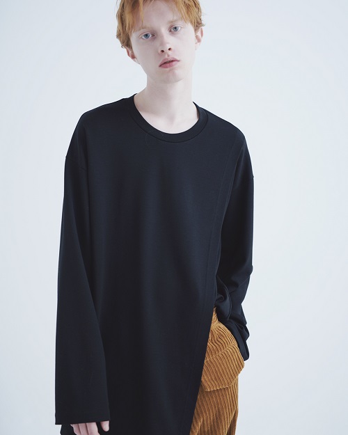 クリアな表面感と適度なドレープ感があるポンチ素材に、大胆なスリットを施したアシンメトリーカットソー。