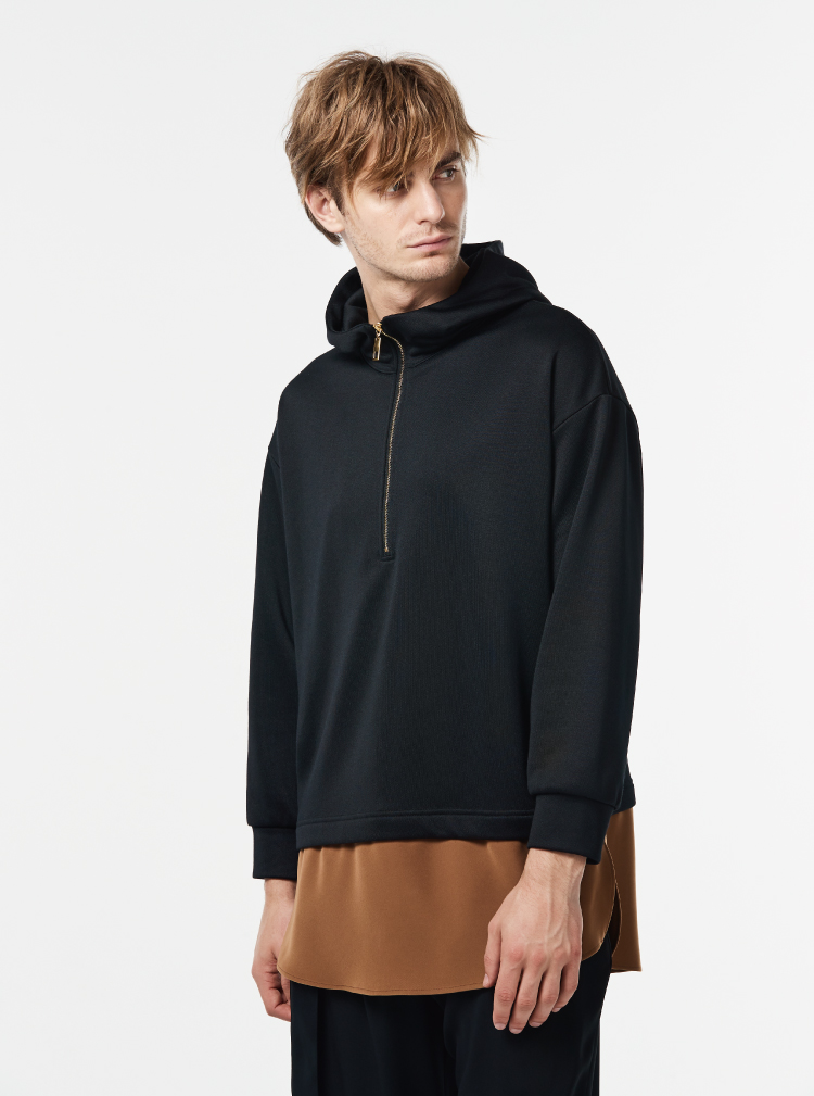 モードな雰囲気にゆとりのあるサイジングがマッチした布帛切り替えパーカ。
