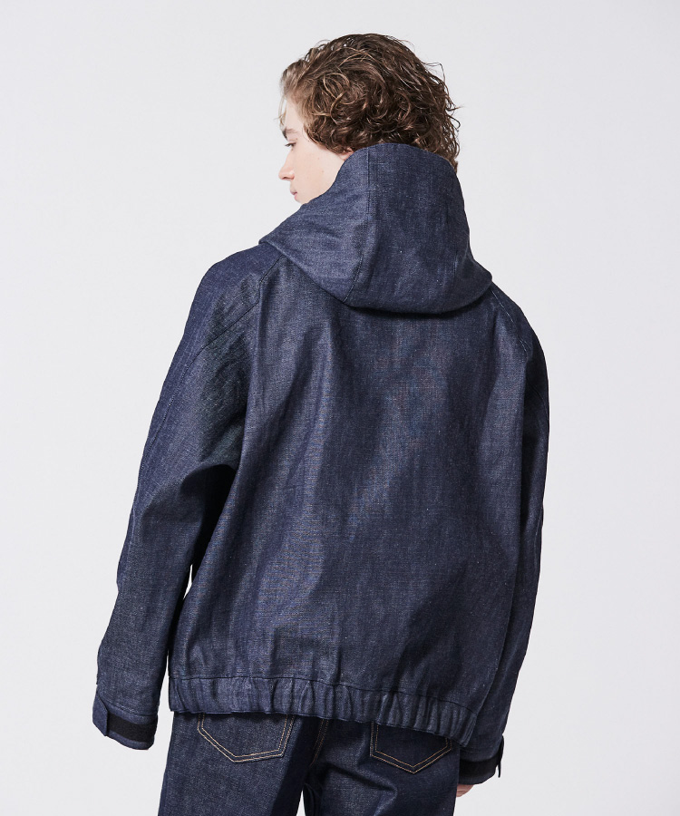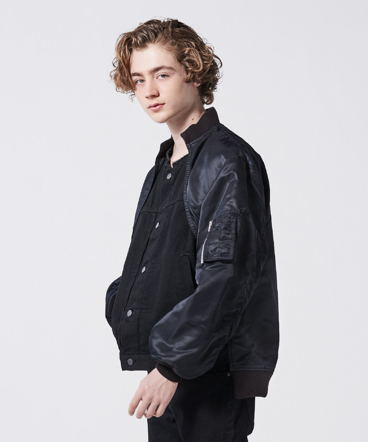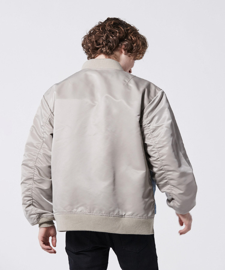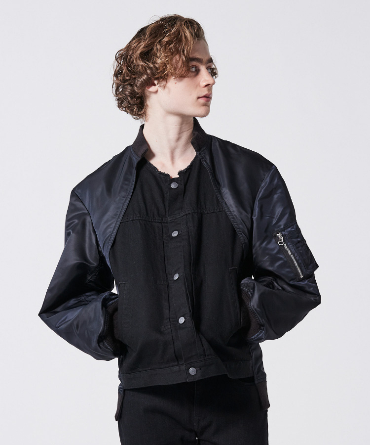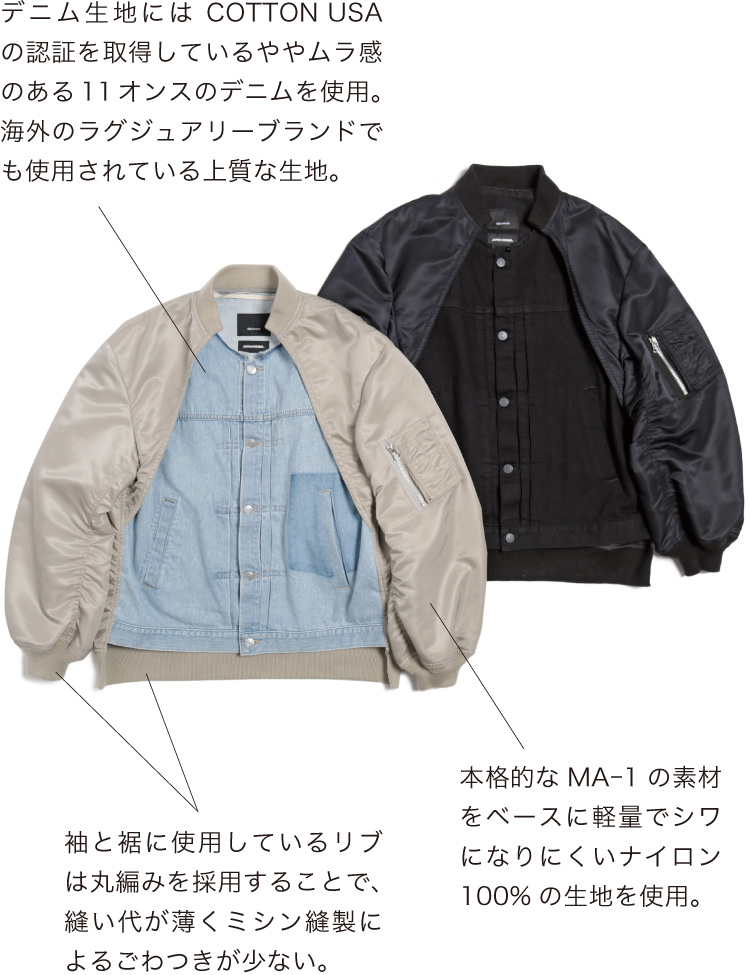 MA-1ブルゾンとデニムジャケットをドッキング。ややルーズ感のあるリラックスシルエットはユニセックスで着用可能。袖筒の縫製をわざとパッカリングさせることで本格的なMA-1を再現。袖筒のパターンは丸みを帯びたカッティングにすることでモダンな印象に。