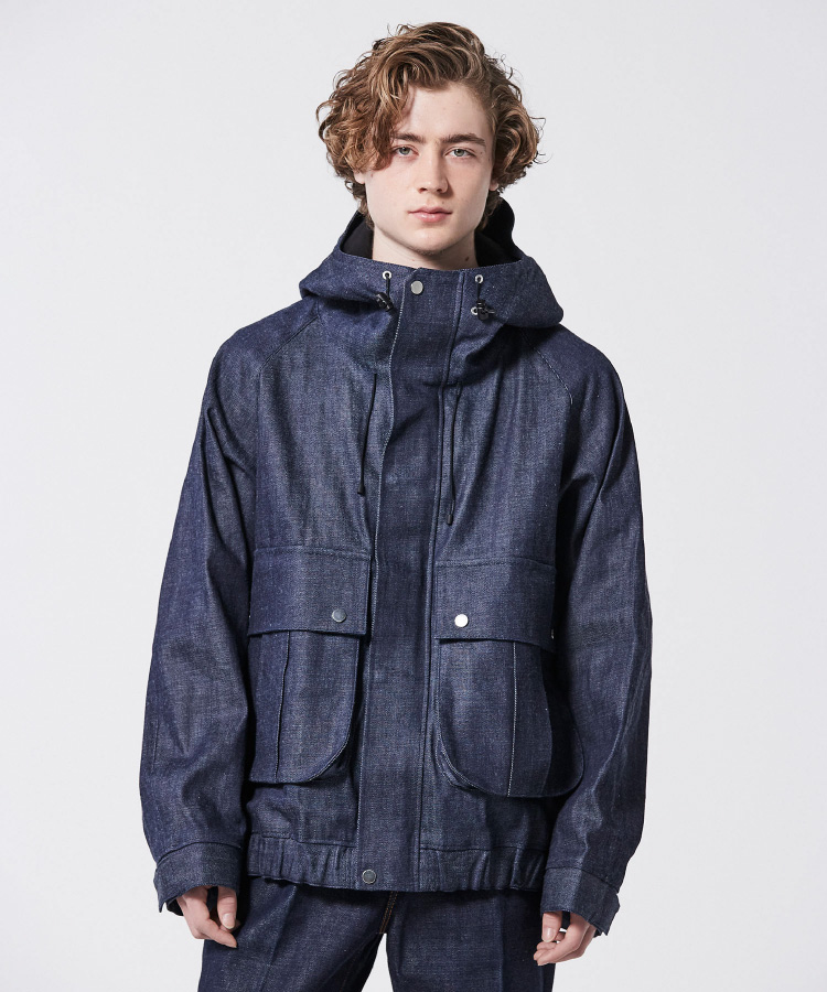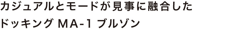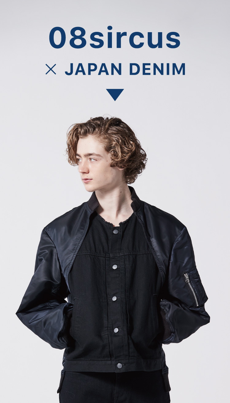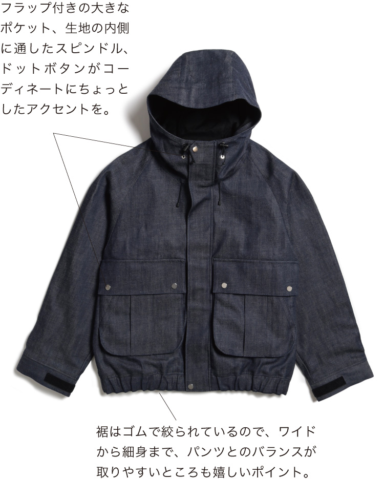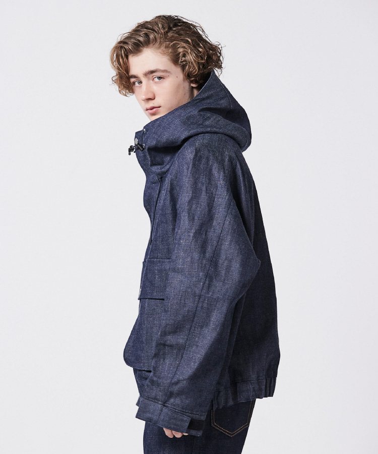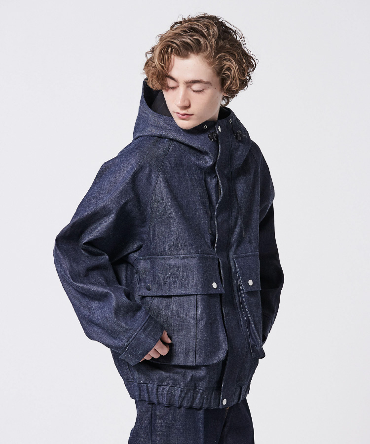 MA-1ブルゾンとデニムジャケットをドッキング。ややルーズ感のあるリラックスシルエットはユニセックスで着用可能。袖筒の縫製をわざとパッカリングさせることで本格的なMA-1を再現。袖筒のパターンは丸みを帯びたカッティングにすることでモダンな印象に。