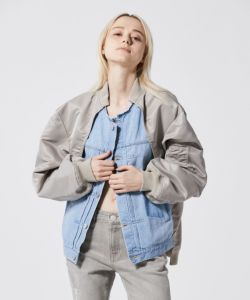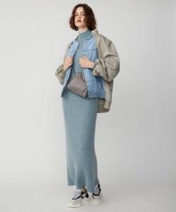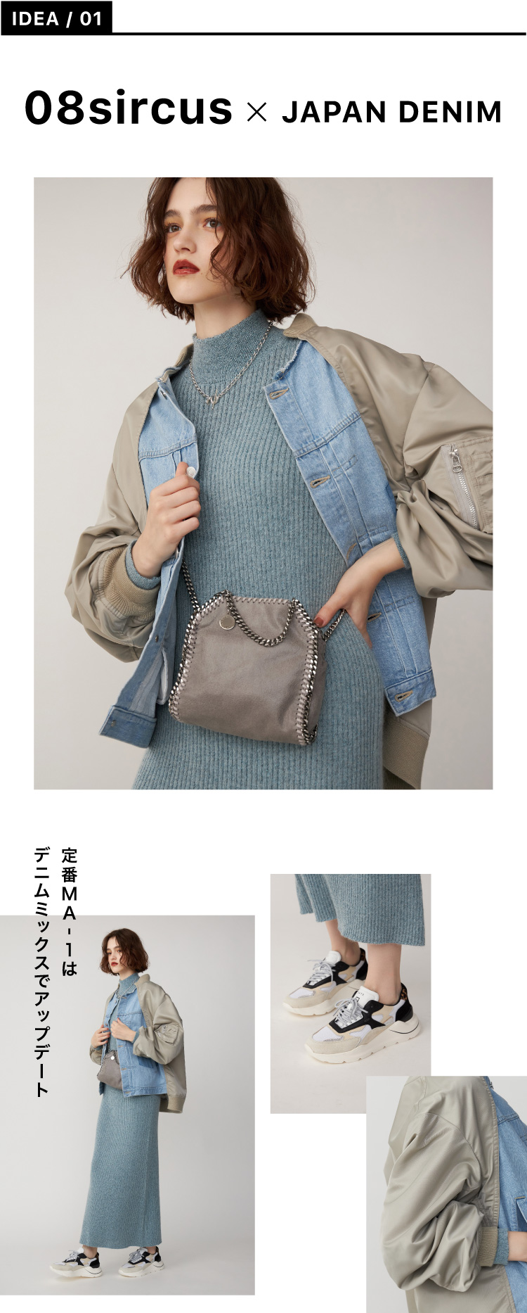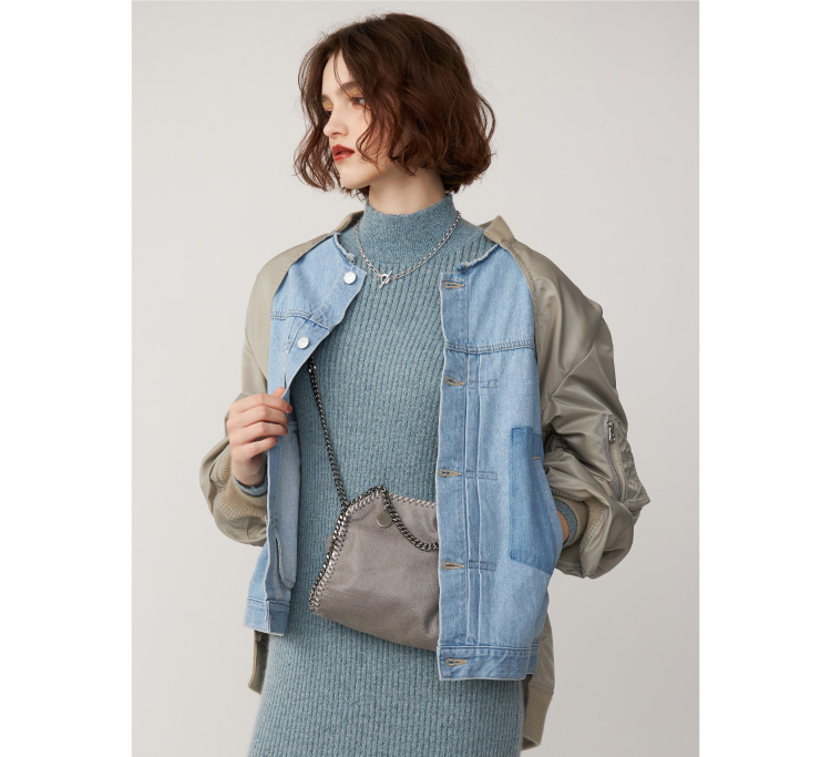 〈08サーカス〉の人気のMA-1を〈ジャパンデニム〉のためにリデザイン。異素材をドッキングした、カジュアルとモードを融合したブルゾン。ジェンダーレスなデザインには、ボディラインを見せたニットワンピースで女っぽく。
