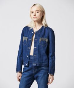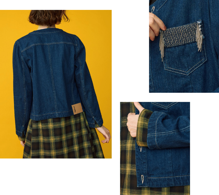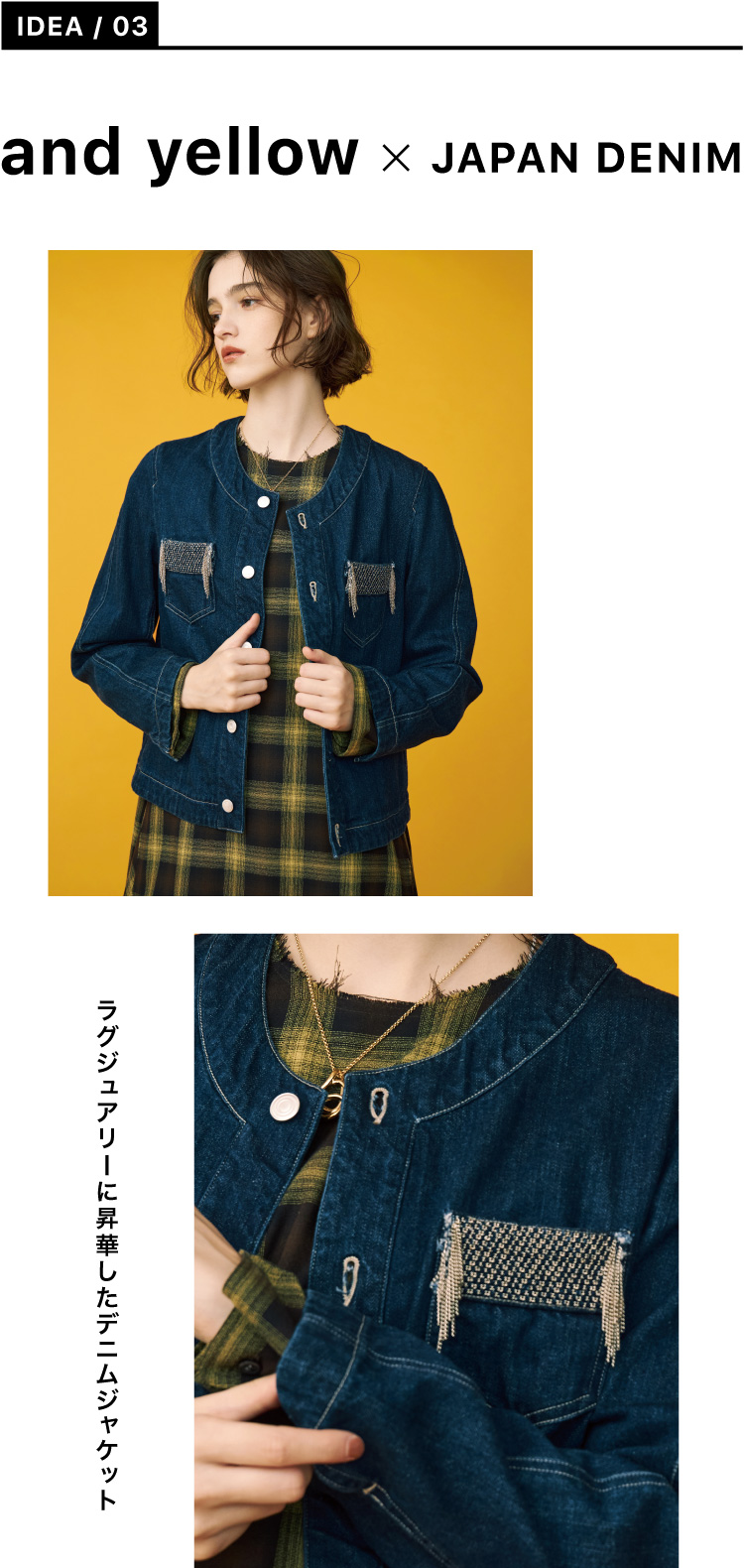 〈08サーカス〉のデザイナー森下公則氏が設立したブランド〈アンドイエロー〉のデニムジャケット。生地に織り込まれたチェーンは、1本1本長い時間をかけて職人が手作業で織り込んでいる。