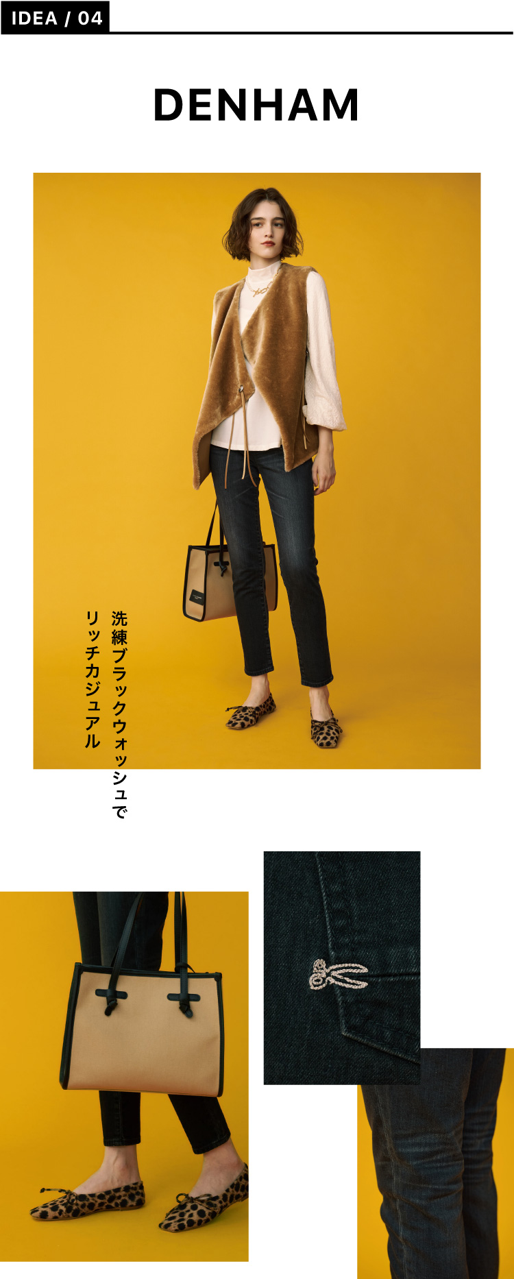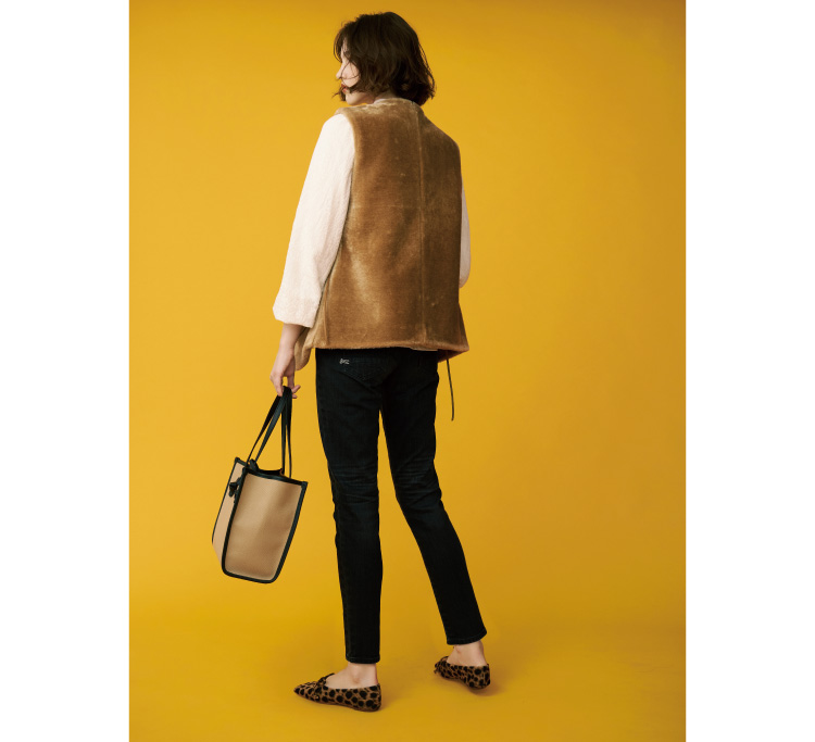 抜群の穿き心地とシルエットの美しさからファンが続出中の〈デンハム〉の“ポイント”から、ハンサムなブラックウォッシュが新登場。リッチ感のあるボアベストと合わせても劣らない存在感がある。