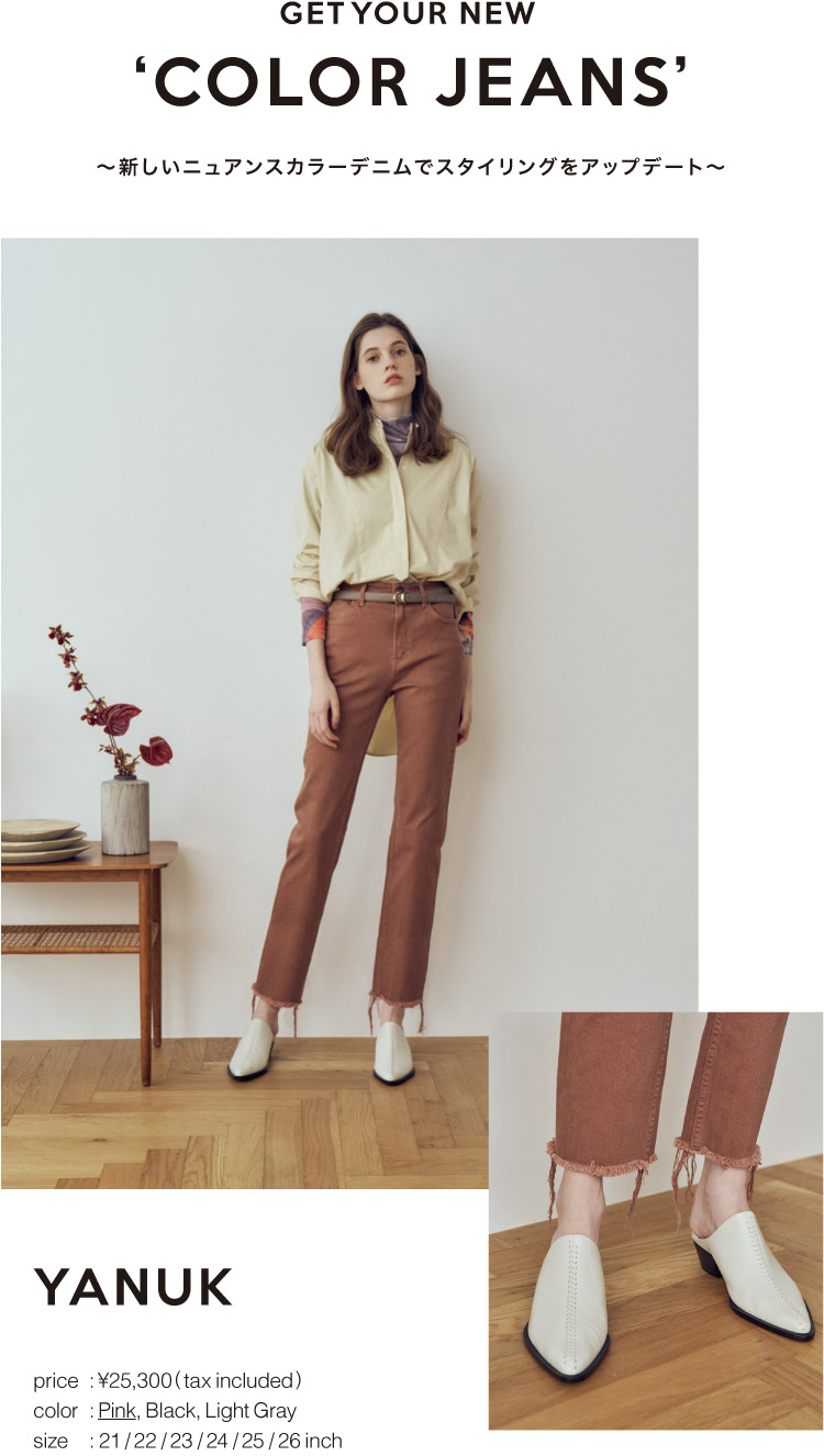 脚長効果のあるハイライズと裾のクラッシュ加工に加え、温かみと深みのあるベイクドピンクのカラーが新鮮な、ストレートシルエットの”ANETTE”。表情感のあるカラーリングで大人が穿けるカラーデニムに。