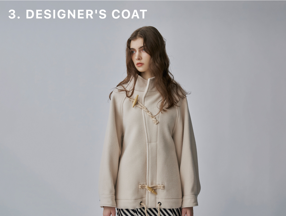 ダブルフェイスの起毛生地を使用したダッフルジャケット。斜めに配された木製のトグルが特徴的。
