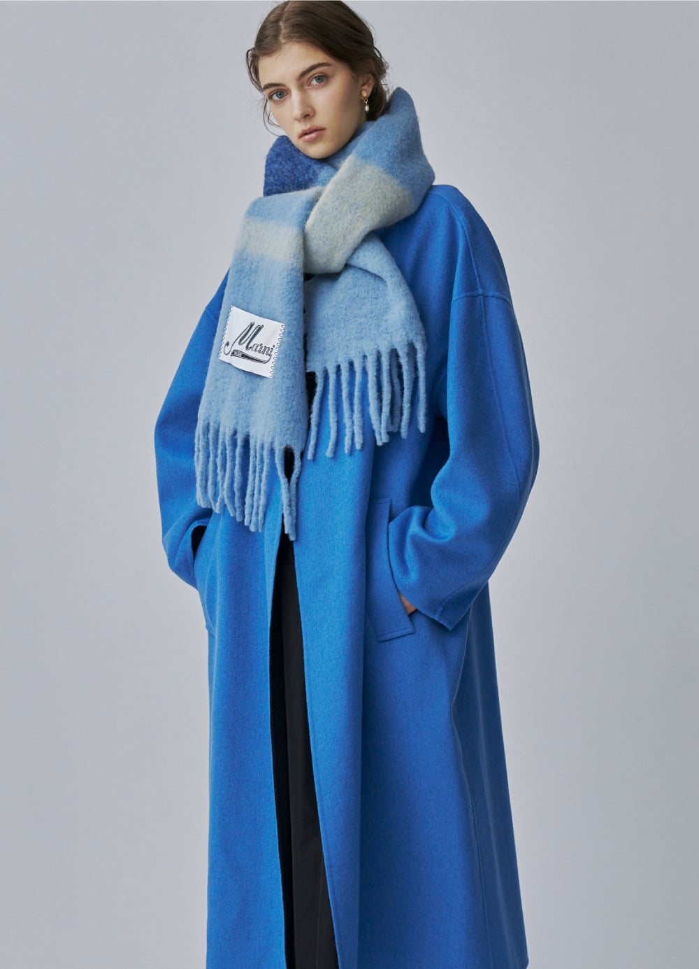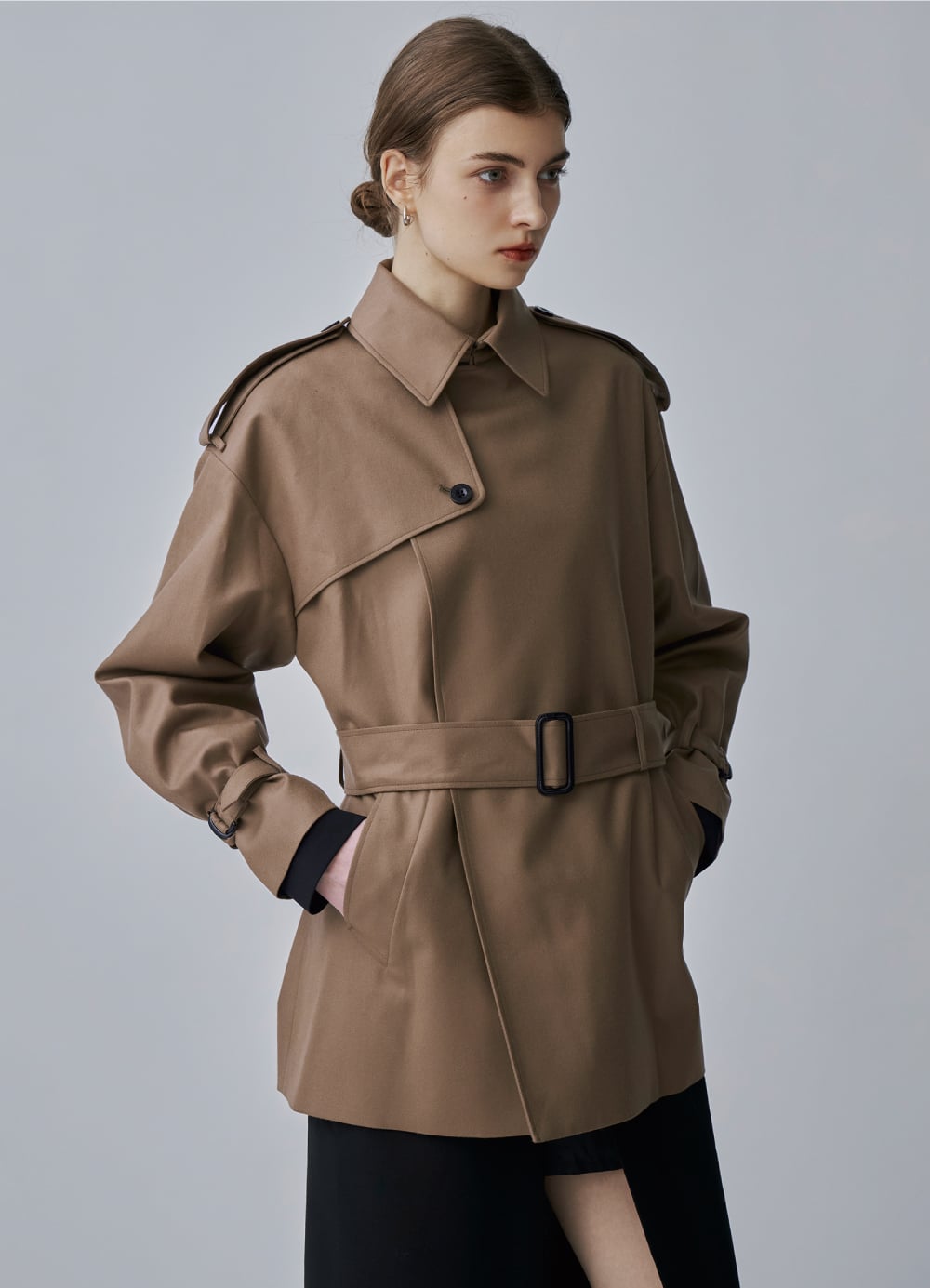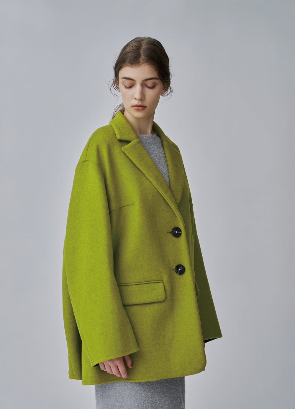 体のラインを隠し創り上げる構築的なシルエットのノーカラーワイドコート。