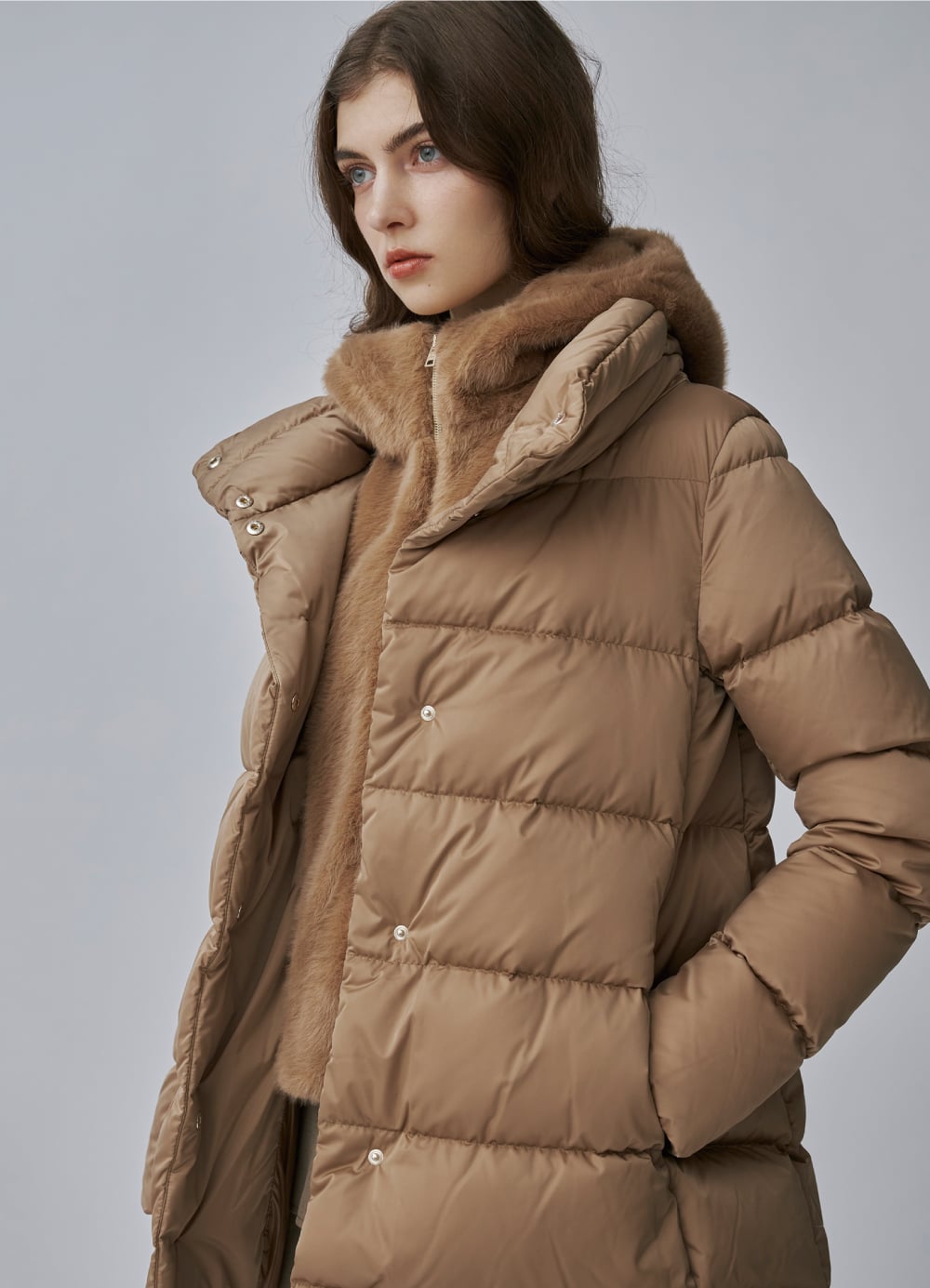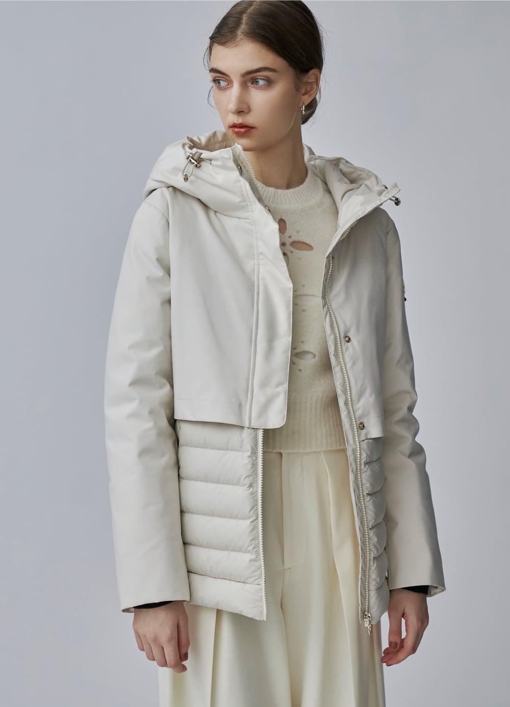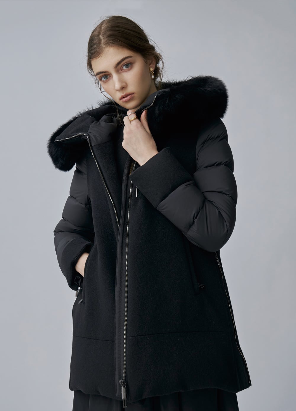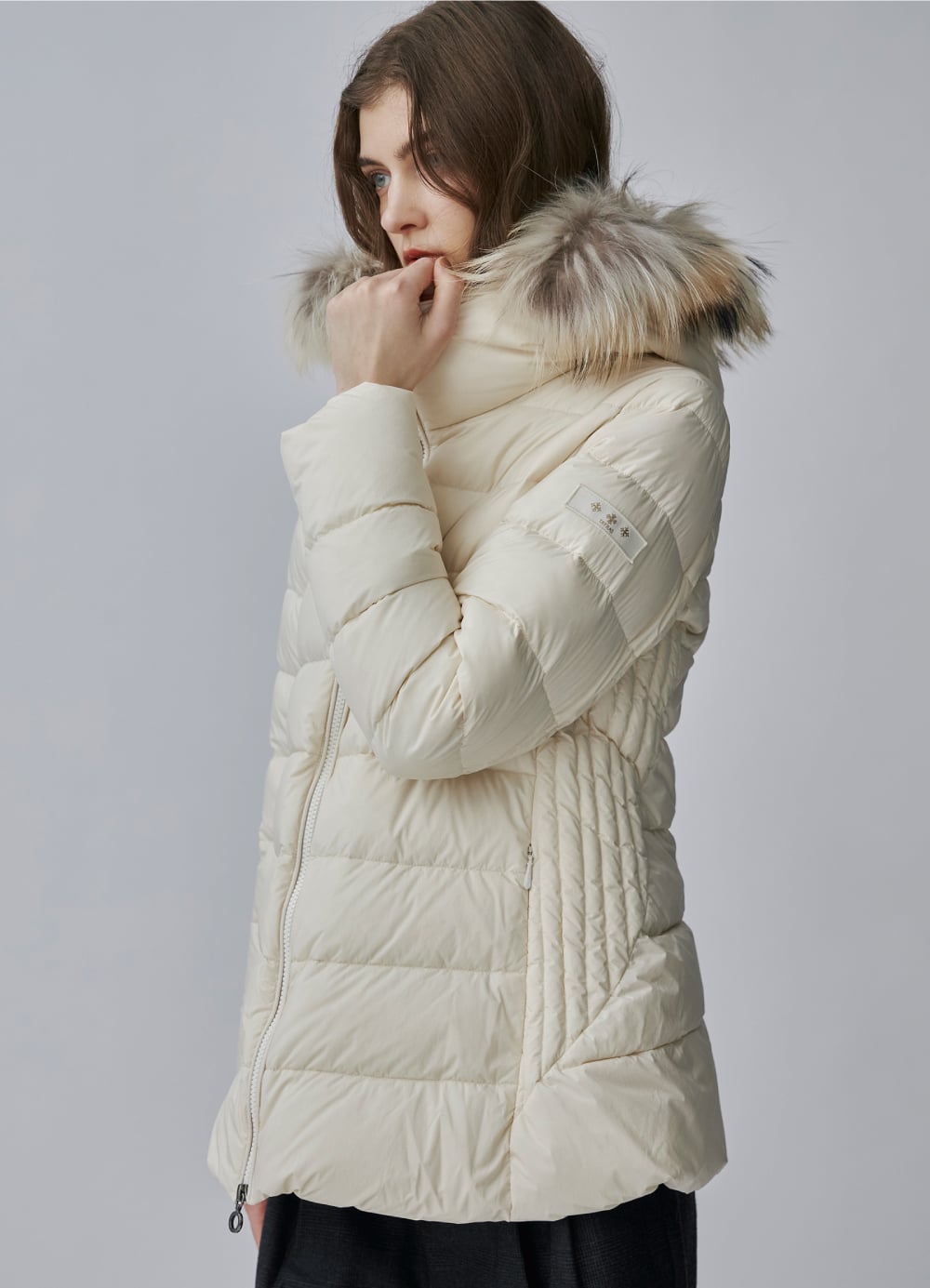 ・(右)体のラインに沿った曲線的なカッティングと、ウエスト部分の立体的 なパターンメイキング、脇に入れた差しステッチにより、ダウンであり ながらもたつきのない美しいシルエットを描く。