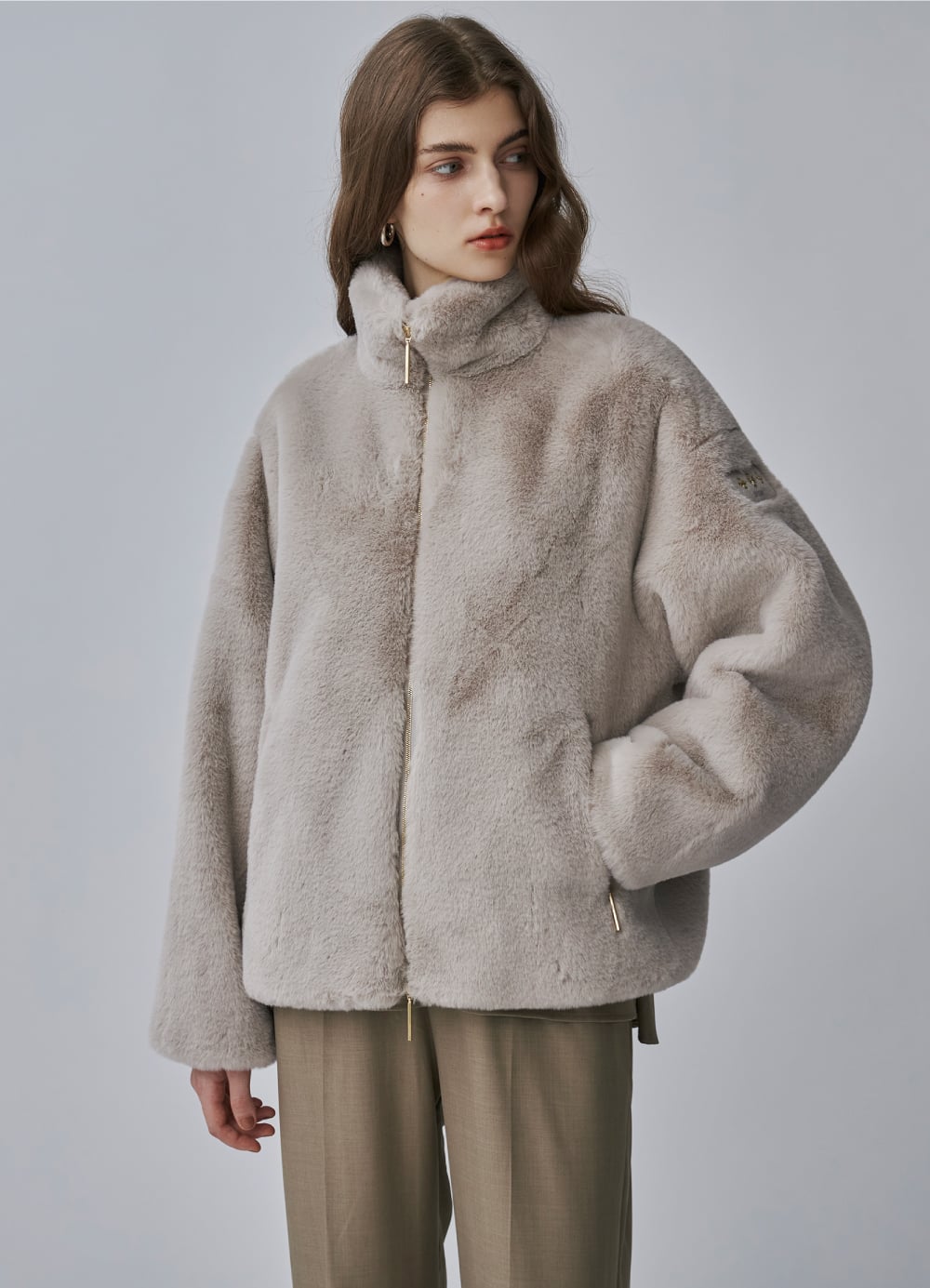 滑らかなラビットファー調のジャケット。ゴールドのパーツがエレガントな印象に。