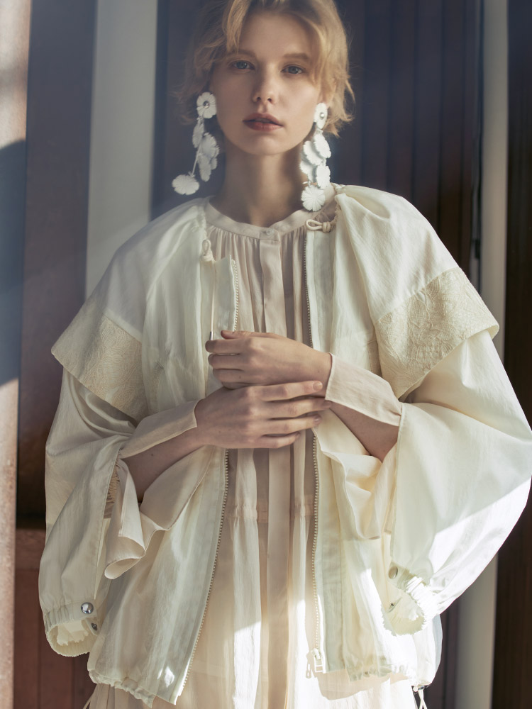 アーム部分に繊細なレースを施したブルゾン。袖部分の生地を二層にすることで立体的な仕上がりとなっています。ネック部分はコードで絞れるデザインにすることでアクセントをプラス。袖のボタンを外して袖スリットのレイヤードを楽しむのがおすすめです!パリゴ限定素材。