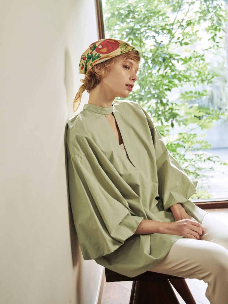 前後着用可能なデザインブラウスはパリゴだけのピスタチオカラーをセレクト。前は深めのVあきデザイン、後ろはシンプルな釦ダウンデザイン。ボリュームのあるバルーンスリーブがポイントで、チュニック丈がヒップをカバーしてくれる着丈が嬉しい。素材は少し洗いのかかったタイプライターを使用しています。
