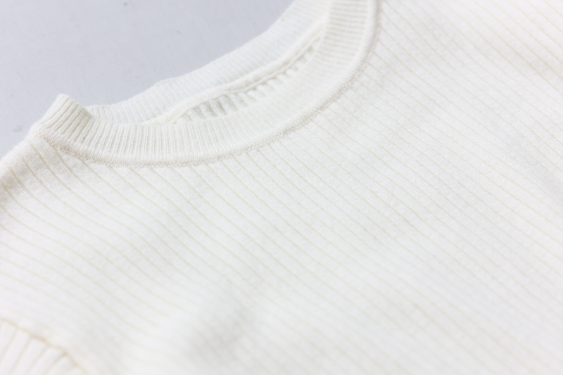 細かいリブ編みのデザインが身体のラインを美しく引き立て、女性らしいシルエットを演出します。
