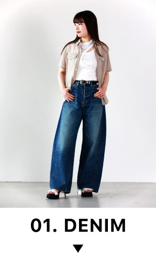 カーブデニムを主役にした、一癖あるコーディネート。大きくカーブした形が1番の魅力です。USED WASH加工が施されているため、程よくビンテージな仕上がりに。こちらをコーディネートに取り入れるだけでオシャレ上級者に見える優れものです。