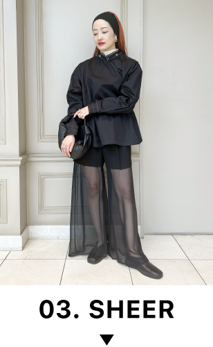 センタープレスが入った膝丈のパンツに、くるぶしまで届くシフォンをレイヤードした特徴的なデザインが魅力的な1本。エレガントな揺れ感とモードな雰囲気を兼ね備えた一着で、シフォンが軽やかに動きを生み出し、洗練された印象を演出します。シンプルなトップスを合わせるだけで、コーディネートに奥行きを与えてくれます。