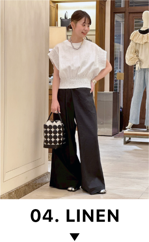 フレンチリネンのしなやかさを活かし、軽やかな動きを感じるデザインに仕上げられたワイドパンツ。サイドにずれたボタンがアクセントとなり、シンプルながら個性を演出しています!ナチュラルな風合いと都会的なシルエットが絶妙に調和し、カジュアルからモードなスタイリングまで幅広く活躍します。