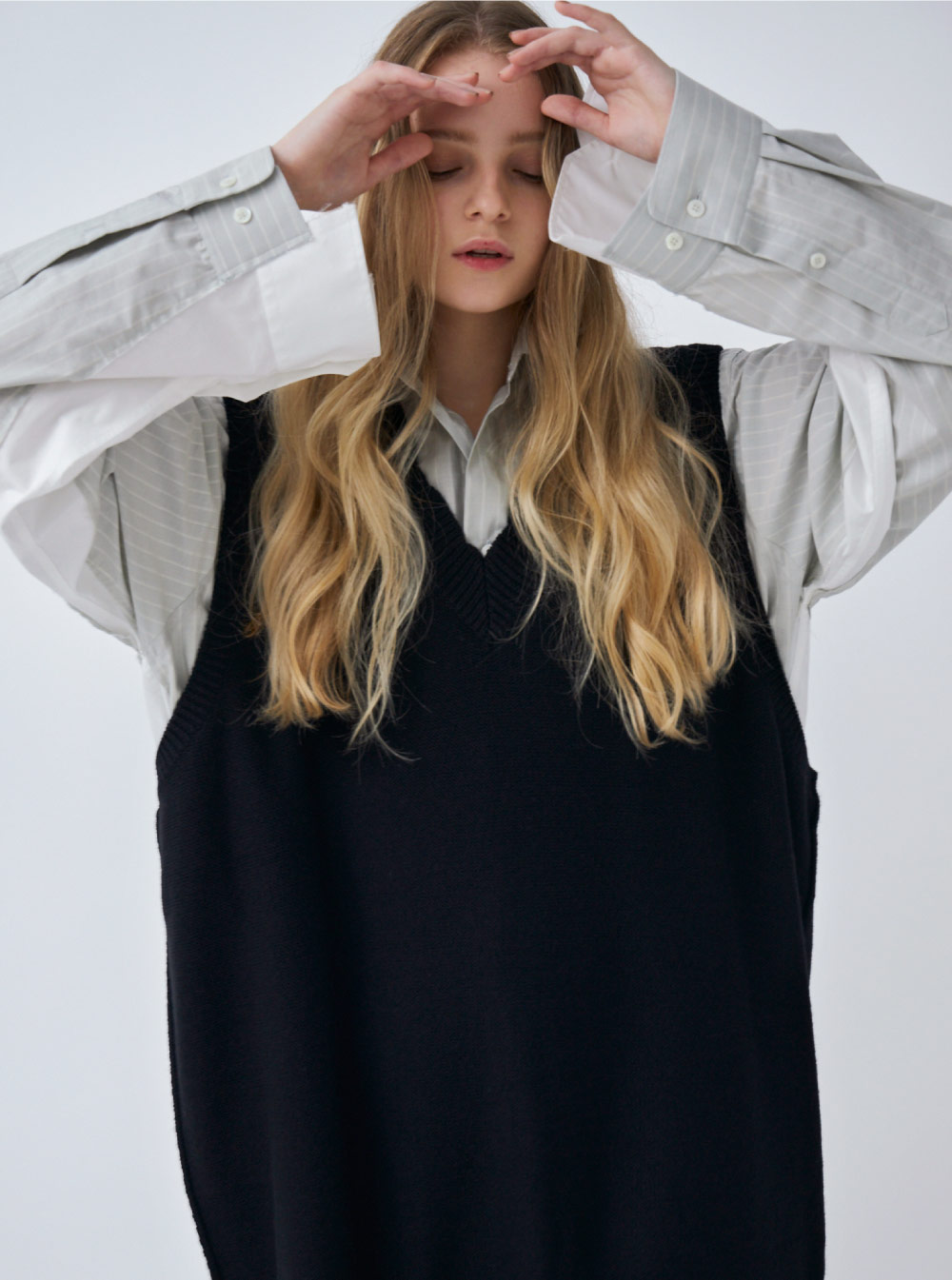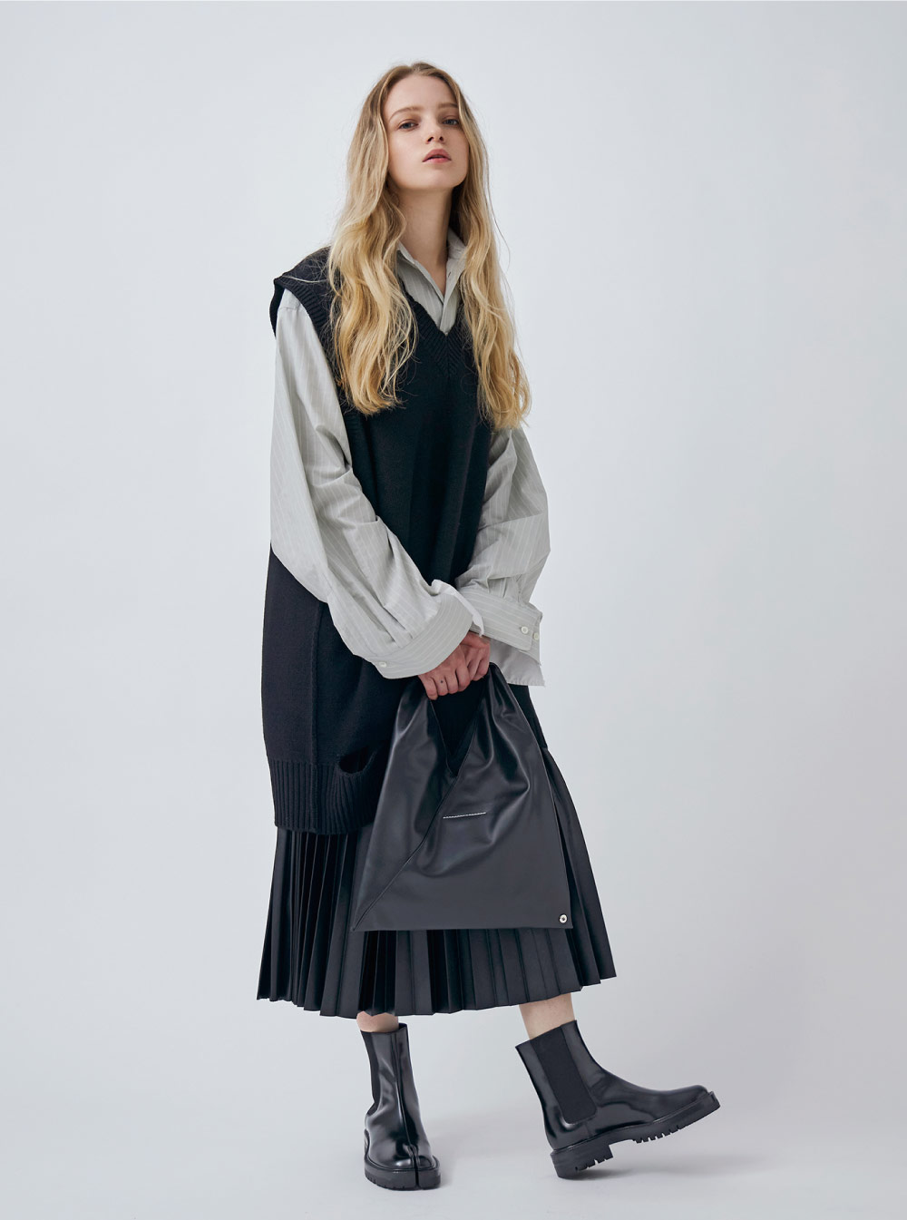 2色の生地をドッキングさせたコットン素材のシャツに、オーバーサイズのニットベストをレイヤード。縦に引き伸ばしたようなシルエットや、あえて衣服に裂け目を施したりと 、〈メゾンマルジェラ〉らしい世界観のあるデザイン。