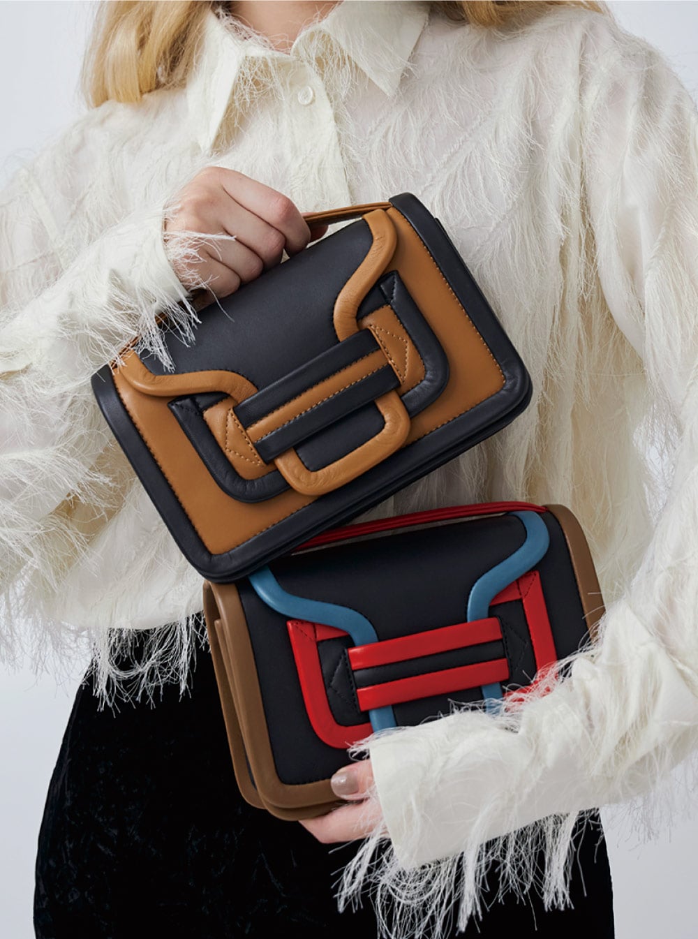 他に類を見ないアートのようなデザインの“アルファ”の新色が登場。鮮やかな色の組み合わせが印象的。ファスナーを使わないシンプルな構造で取り外し可能なクロスボディストラップが付いており、斜め掛けも可能。