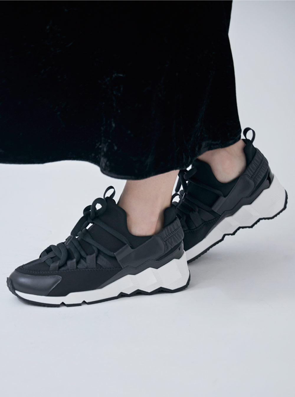 スポーティでありながら洗練されたデザインで、日々のどのスタイリングにもフィットするパーフェクトな1足。特徴的なキューブ柄をプレスしたソールが目を惹き、後方部のパテントレザーがモード感と遊び心を兼ね備えている。約4cmの厚みがあるソールが自然にスタイルアップを叶えてくれる。