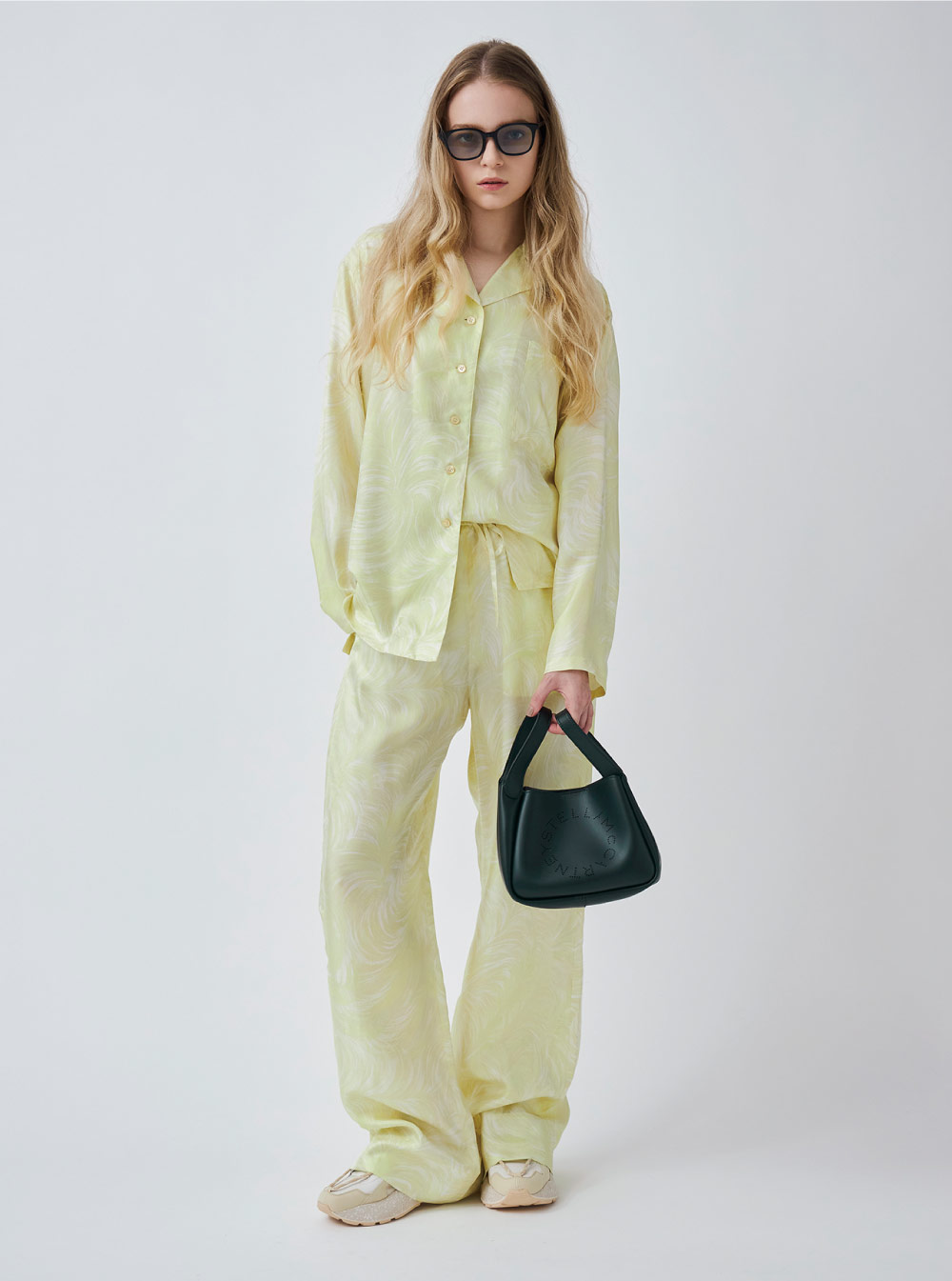 シルクの名産地、イタリア・コモの伝統的なシルクを使用したオーバーシルエットのセットアップ。肌なじみの良いバターイエローで表現されたフェザー柄が印象的。