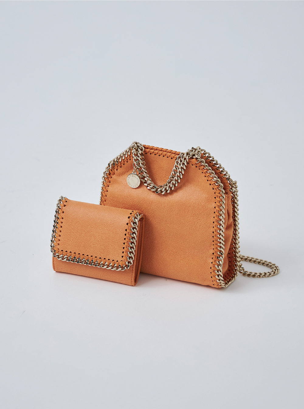 ダイヤモンドカットチェーンが特徴的な“ファラベラ”から、今シーズンは鮮やかなパパイヤオレンジが登場。ライトゴールドのチェーンとの組み合わせが上品なカラーリング。