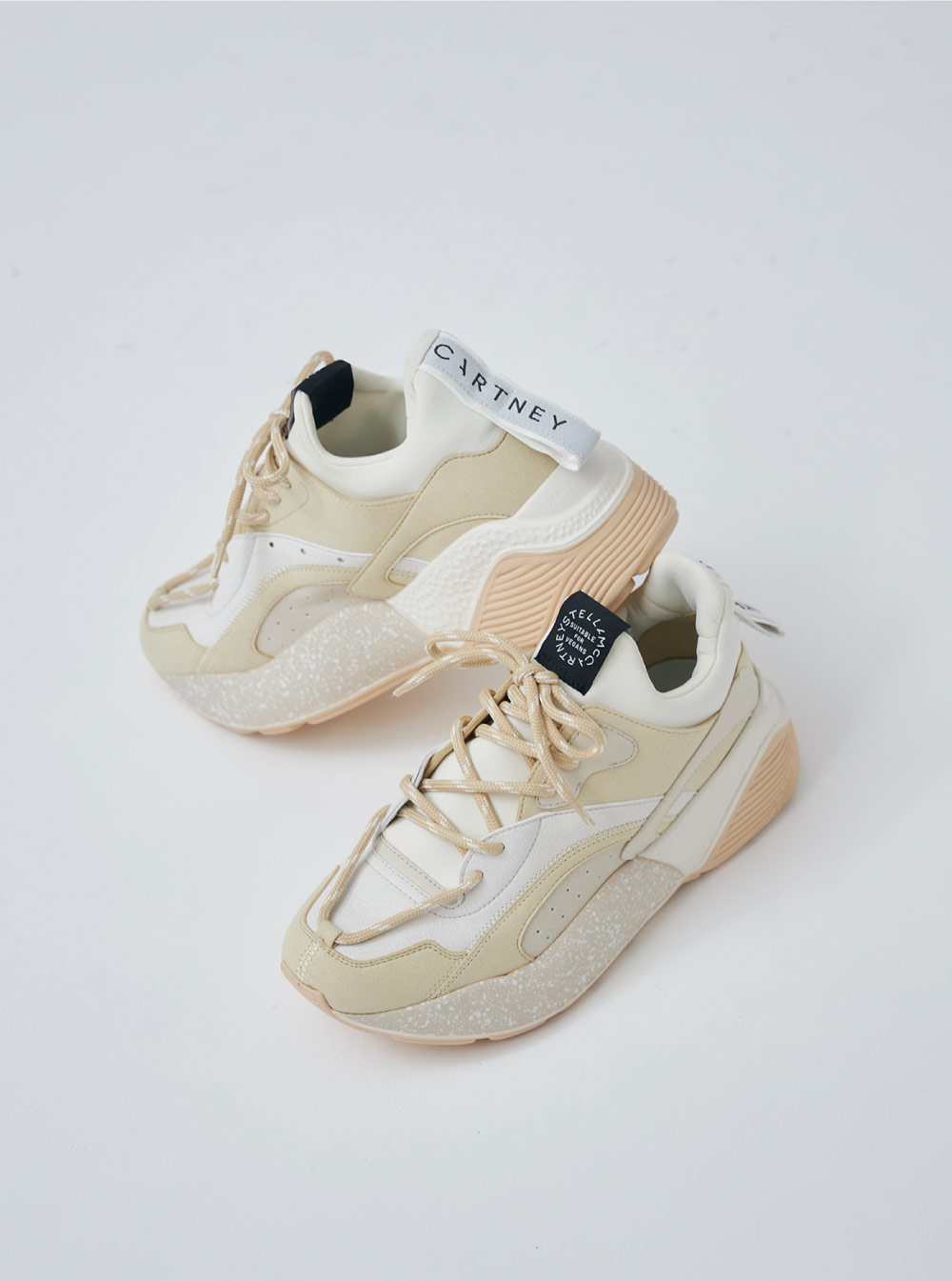 パンプアップミッドソールが洗練されたムードを漂わせる。ペールピンク、ホワイトのカラーブロックアッパーを配したレースアップフロントのデザイン。クルエルティフリーの素材を使用し、ヒールのロゴのプルタブがポイント。