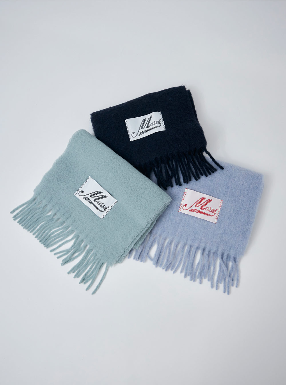 アルパカ繊維特有の滑らかな手触りと保温性の高さが魅力。ラベルにはイタリック体でアレンジした〈マルニ〉のロゴ入りで、シンプルなルックスながらこだわりが詰まったデザイン。