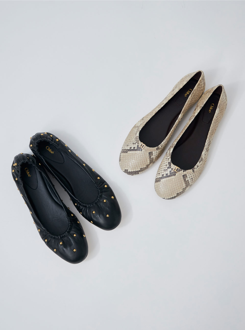 タイプの違うバレエシューズ2種。ゴールドのスタッズとプリーツを施したアッパーがフェミニンさを醸し出す“イーア”(左)と、 パイソンプリントゴートスキンにアイコニックなゴールドパーツがモダンな仕上がりの “マーシー”(右)。