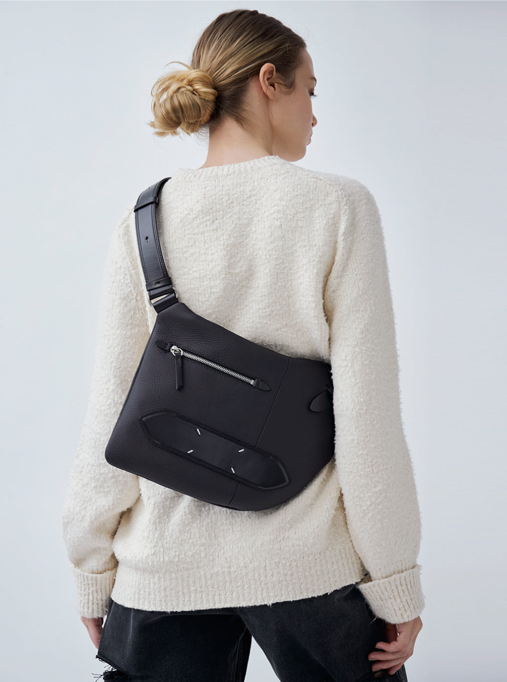 上質な2種類のレザーを贅沢に使用し、シックに仕上げた “5AC”オンボディ。他にない独特のフォルムとフロントの切り替えられたカーフレザーに施された4 ステッチが映えるデザイン。デイリーユースしやすいサイズ感と機能性が魅力。クラッチ、ショルダーと持ち方のバリエーションも楽しめる。