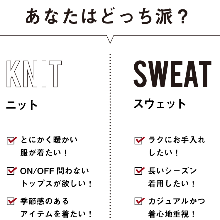 今回はニット派とスウェット派にわけて、今季おすすめのアイテムをご紹介!