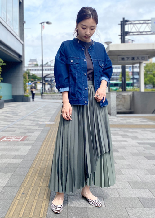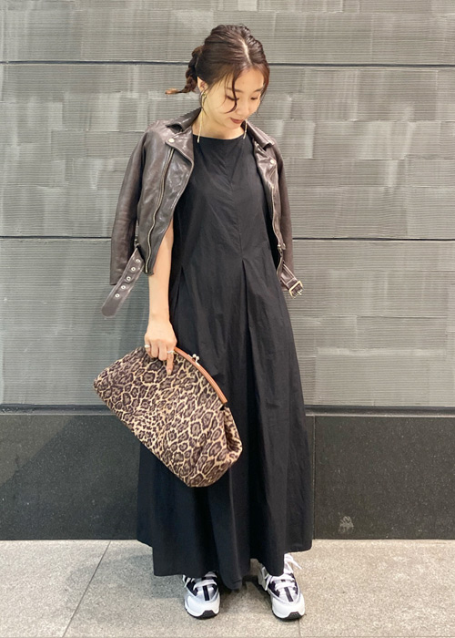 ハードになりがちなレザージャケットですが、フェミニンな雰囲気にまとめてくれます。