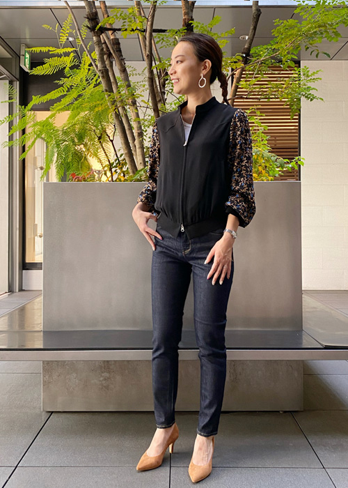 袖の刺繍が美しく、羽織るだけでコーディネートを華やかにしてくれるアイテムです。