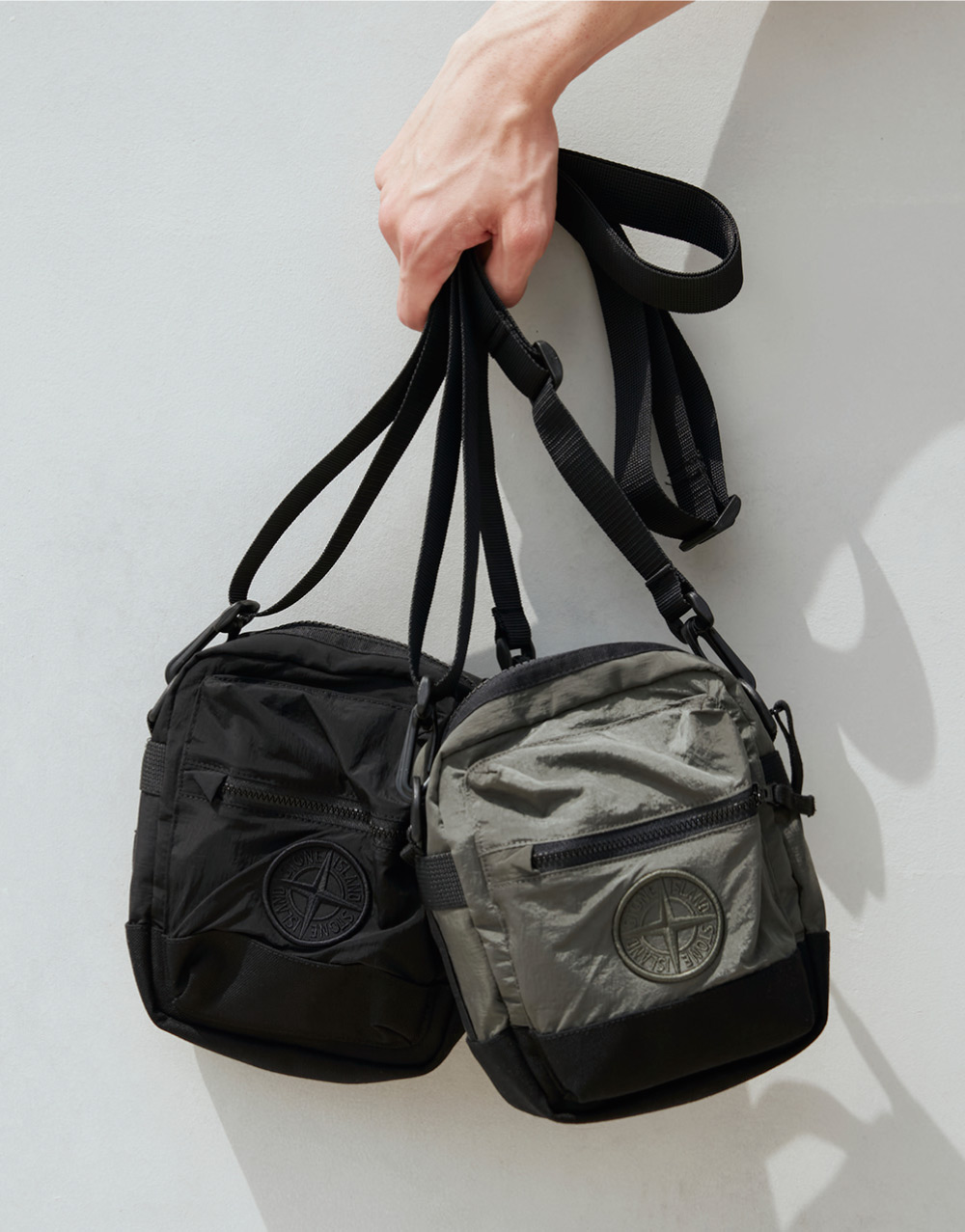 玉虫色のナイロンメタル地を使用したショルダーバッグ。アイコニックなナイロンメタルを進化させた素材で、再生ECONYL®を採用。さらにコットンとの異素材切り替え、同色ワッペンでデザインを加えたアイテム。