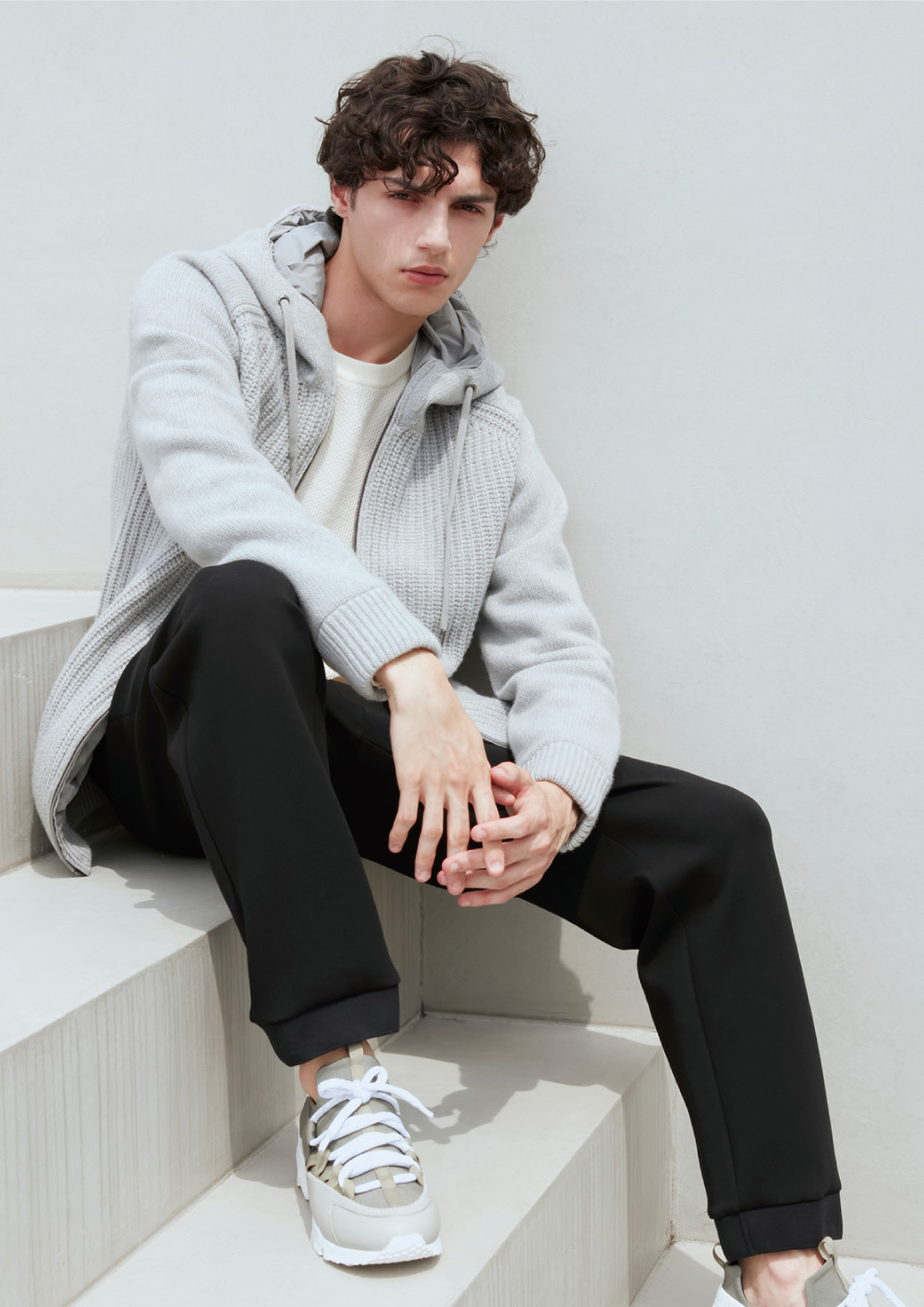 ラグジュアリーなムードが漂う、リバーシブルニットのフーディブルゾン。高品質なニットを採用し動きやすさも考慮したアイテム。ボトムはボンディング素材でストレッチ性抜群のコンフォータブルを意識。ホームウェアからウィンターリゾートなど、リュクスな雰囲気とリラックスさが融合したスタイリング。