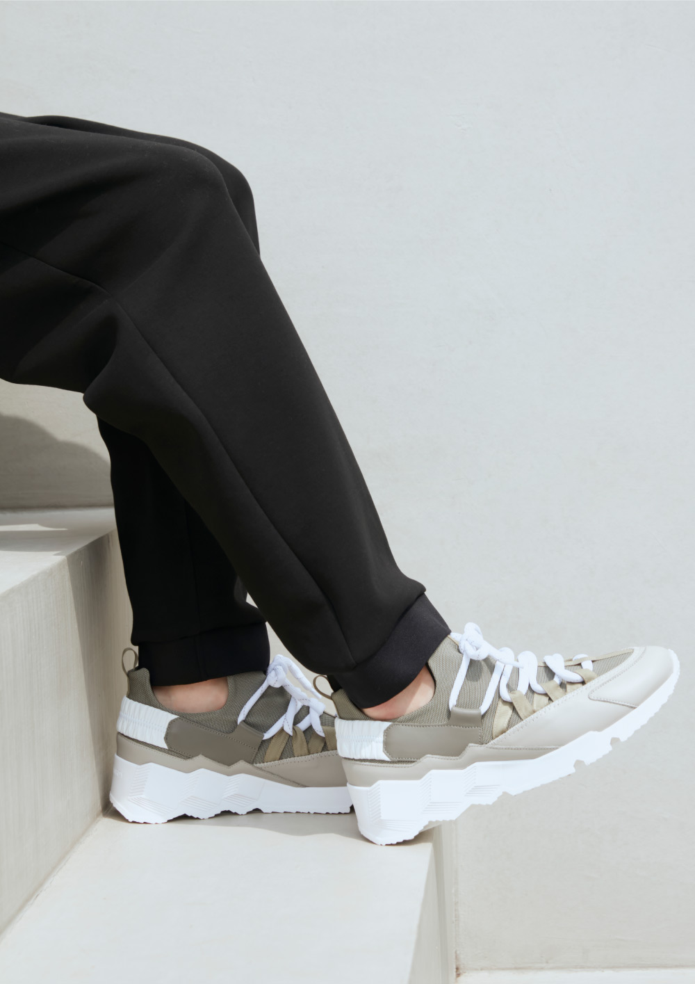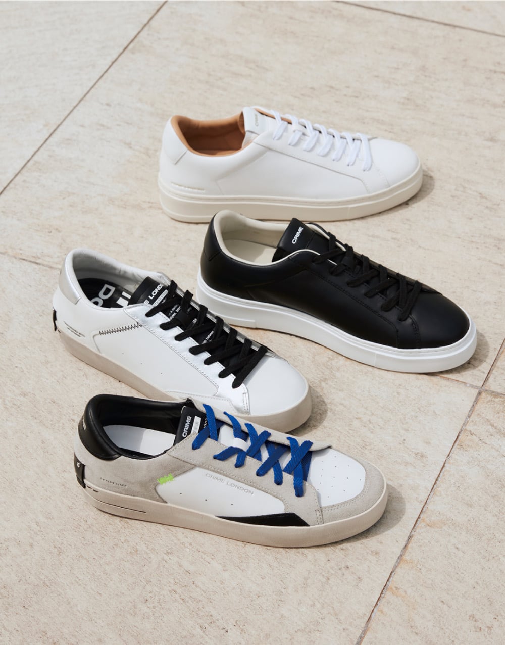 最高級のイタリアンカーフレザーを使用し、どんなスタイルにも合うデイリースニーカーを作ろうというアイデアから誕生。バルカナイズソールと2cmのレザーカップインインソールを採用。ヒールカップのクラシックレザーに 2つのスタッズデザインはブランドのアイコン。
