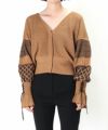 ラフな印象を与えながら、深いVネックの抜け感のあるスタイルが女性らしさをプラス。ボリュームのある両袖の袖口は編み上げのアクセントにニットを重ね、レイヤード風に。