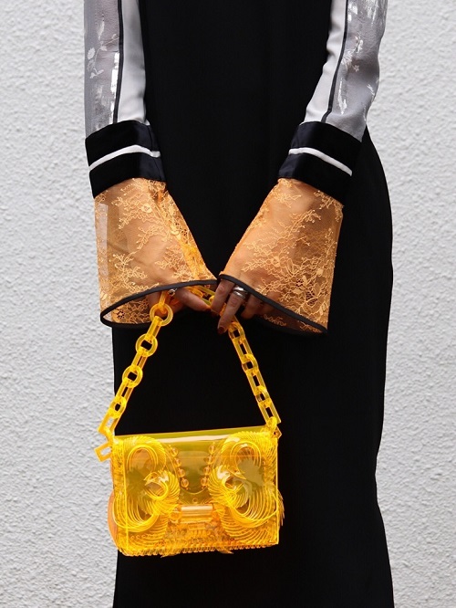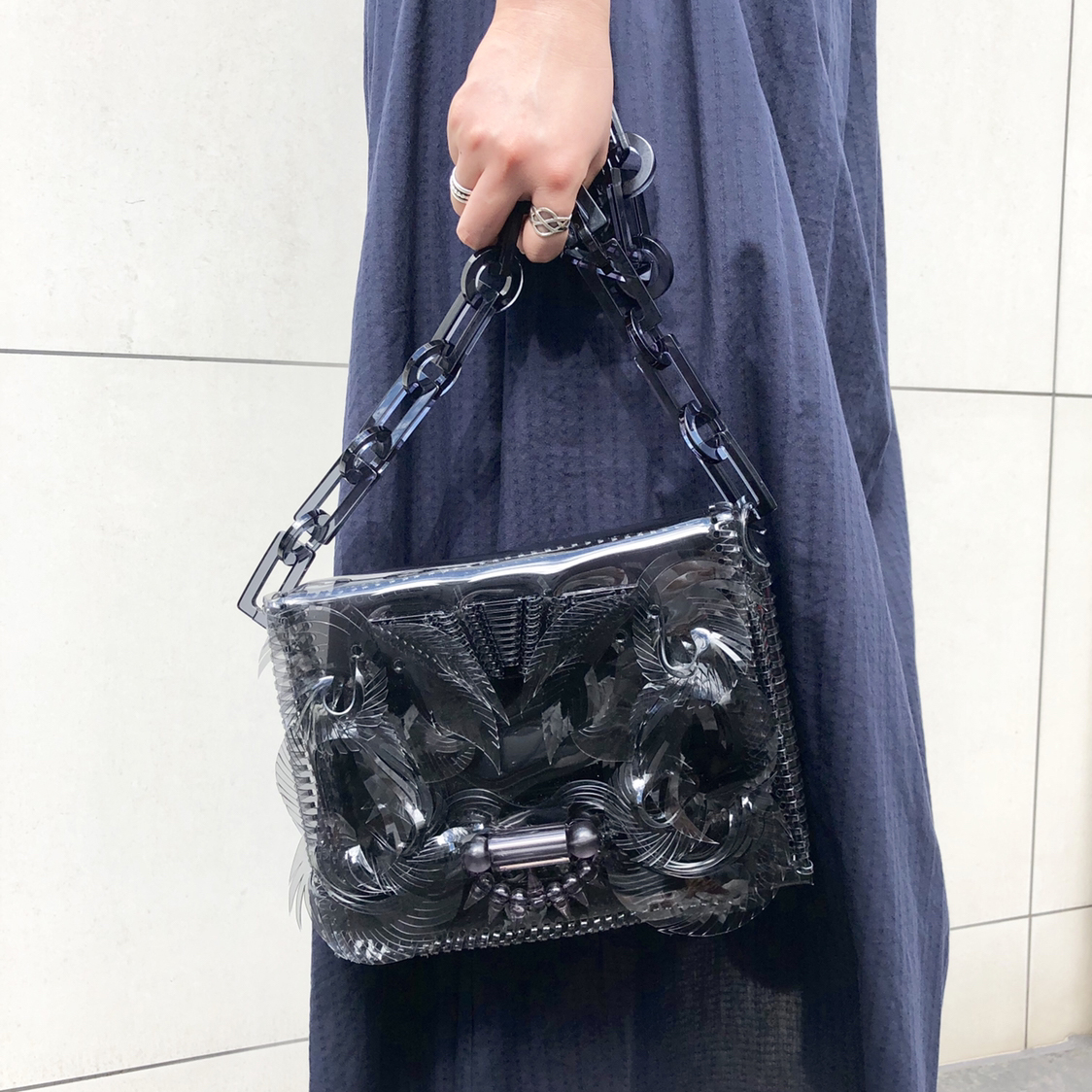 ポリ塩化ビニールのクリア素材を使用したアイコニックなチェーンバッグ。