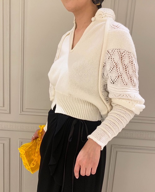両袖には様々な編み地を合わせ、肌を透かす透かし柄のデコルテに続くように、女性らしいアールのついたラインが浮かび上がるデザイン。